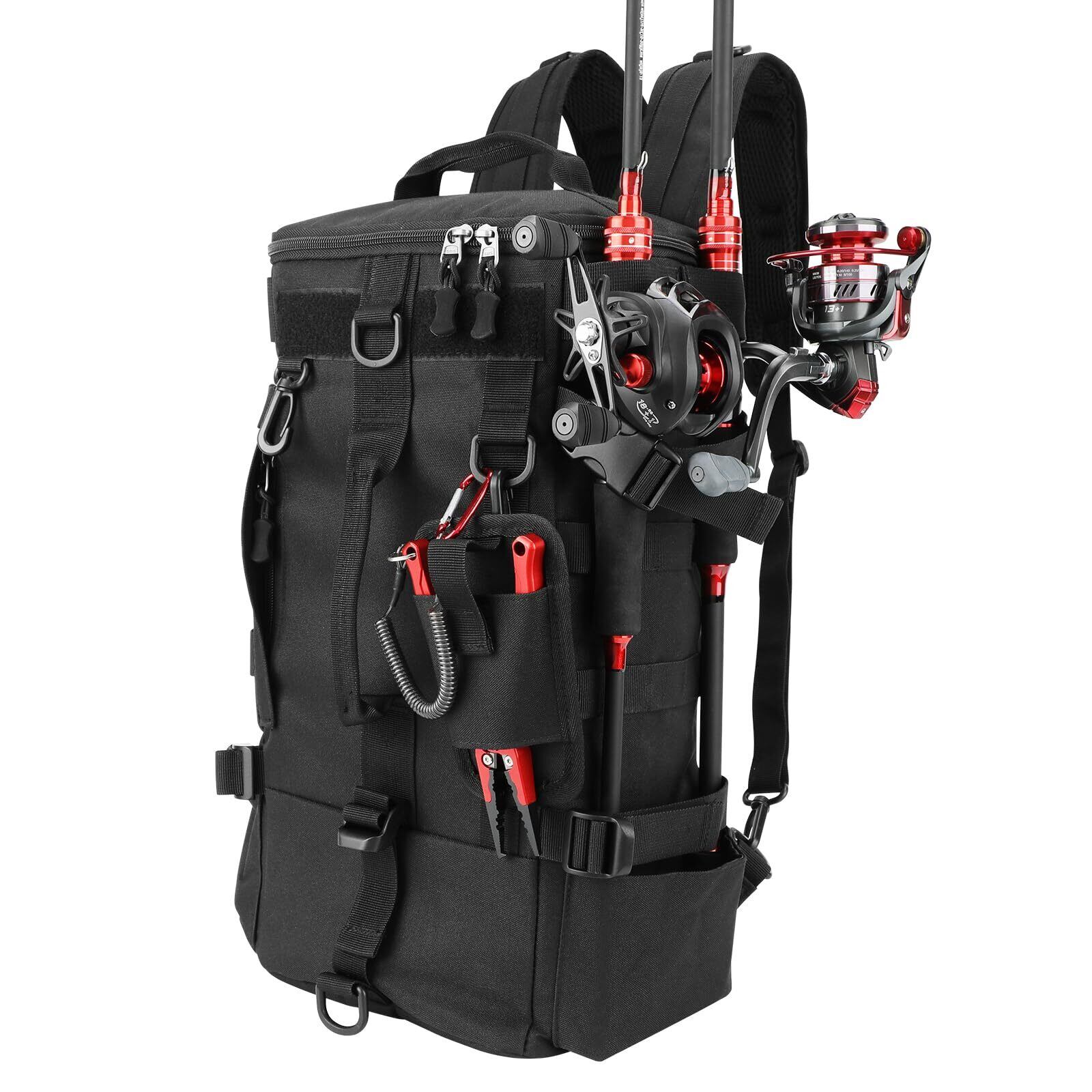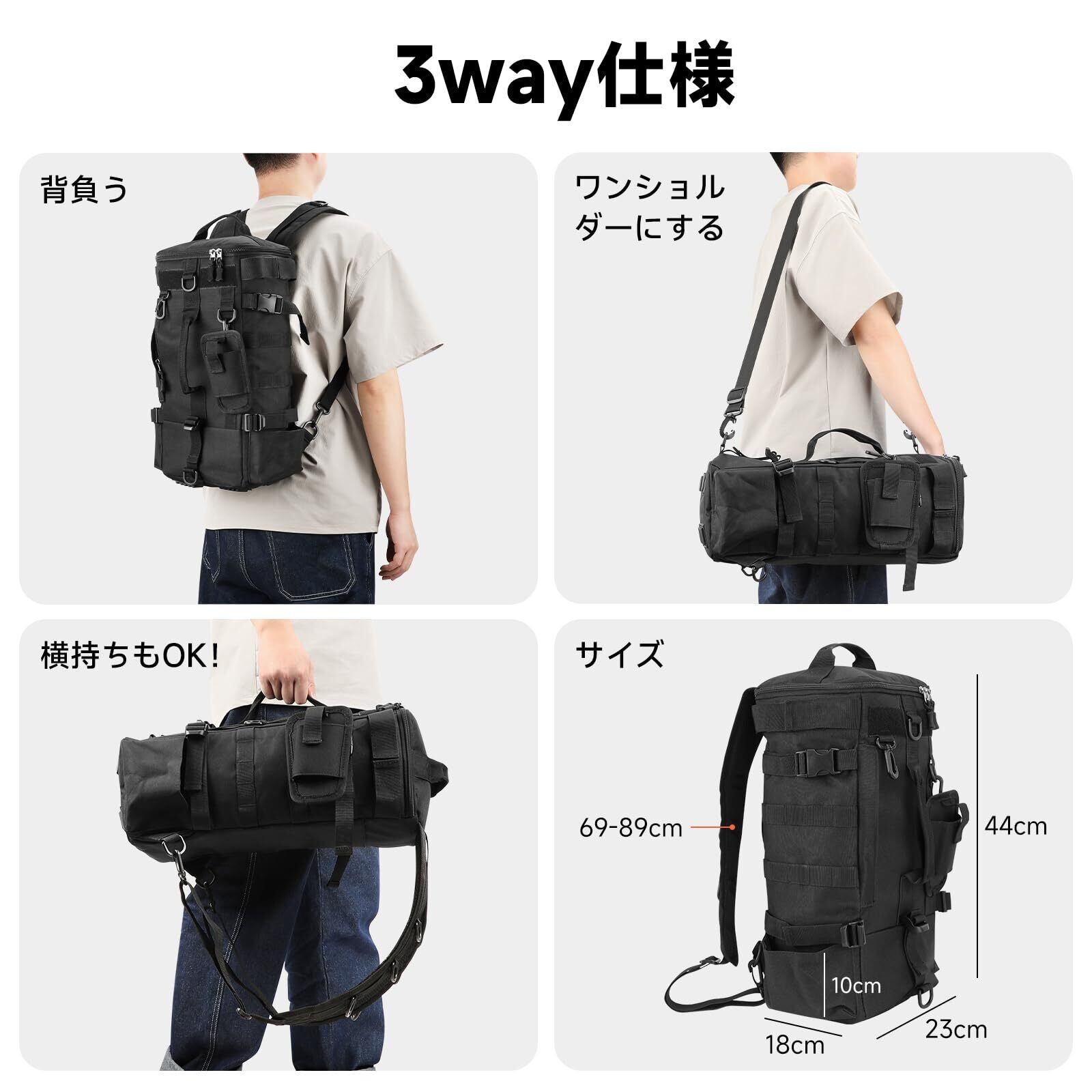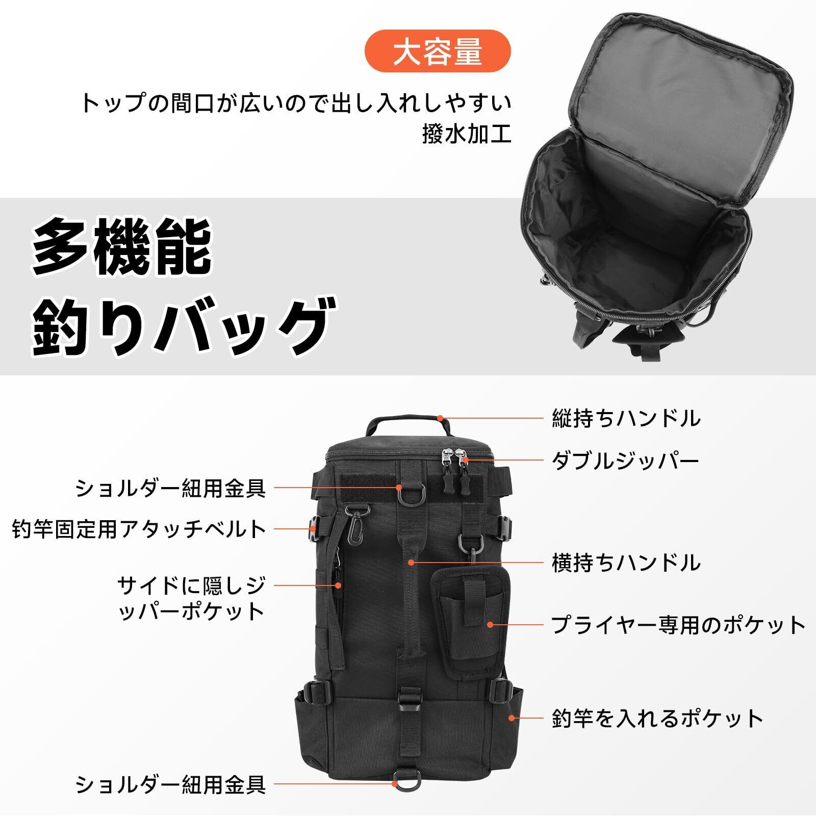 仕様--素材:オックスフォード生地 サイズ:長さ21cm × 幅17cm × 高さ43cm 重量:820g カラー:ブラック 大容量ながらも大きすぎない設計。釣りからアウトドアまで幅広い場面で活躍します。渓流から海まで、これ一つで必要な道具をしっかり収納可能。 [ご注意] 商品画像の小物類はイメージ写真の為、付属しません。