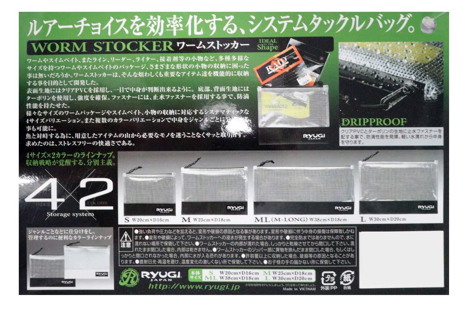 表面生地にはクリアPVCを採用し、一目で中身が判断出来るように。 底部、背面生地にはターポリンを使用し、強度を確保。 ファスナーには、止水ファスナーを採用する事で、防滴性能を持たせた。 様々なサイズのワームパッケージやスイムベイト、小物の収納に対応するシステマティックな4サイズバリエーション。 ルアーチョイスを効率化する、システムタックルバッグ。 ワームやスイムベイト、またライン、リーダー、ライター、接着剤等の小物など、多種多様なサイズを持つワームやスイムベイトのパッケージ、 さまざまな形状の小物の収納に困った事は無いだろうか。 ワームストッカーは、そんな煩わしくも重要なアイテム達を機能的に収納する事を目的として開発した。 表面生地にはクリアPVCを採用し、一目で中身が判断出来るように。 底部、背面生地にはターポリンを使用し、強度を確保。 ファスナーには、止水ファスナーを採用する事で、防滴性能を持たせた。 様々なサイズのワームパッケージやスイムベイト、 小物の収納に対応するシステマティックな4サイズバリエーション。 また複数のカラーバリエーションで中身をジャンルごとに分別する事も可能に。 魚と対峙する為に、用意したアイテムの山から必要なモノを迷うことなくサッと取り出す。求めたのは、ストレスフリーの快適さである。 ※ ご注意 ※ 本製品はワームをパッケージごと収納する事を前提とした製品です。 ワーム本体と本製品が接触した場合、可塑剤の移行が発生し本体が劣化する場合があります。 また、パッケージから可塑剤が漏れ出した場合も同様ですのでご注意下さい。