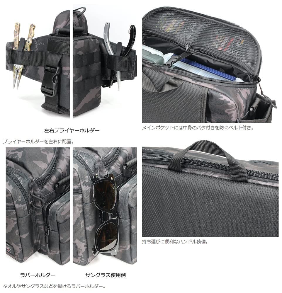 このバッグは大容量のデザインで、釣り用具や小物を効率よく収納できます。メインポケットにはルアーや仕掛けを余裕で収納でき、サイドポケットやフロントポケットも豊富に備えており、必要なアイテムをすぐに取り出せる仕様となっています。