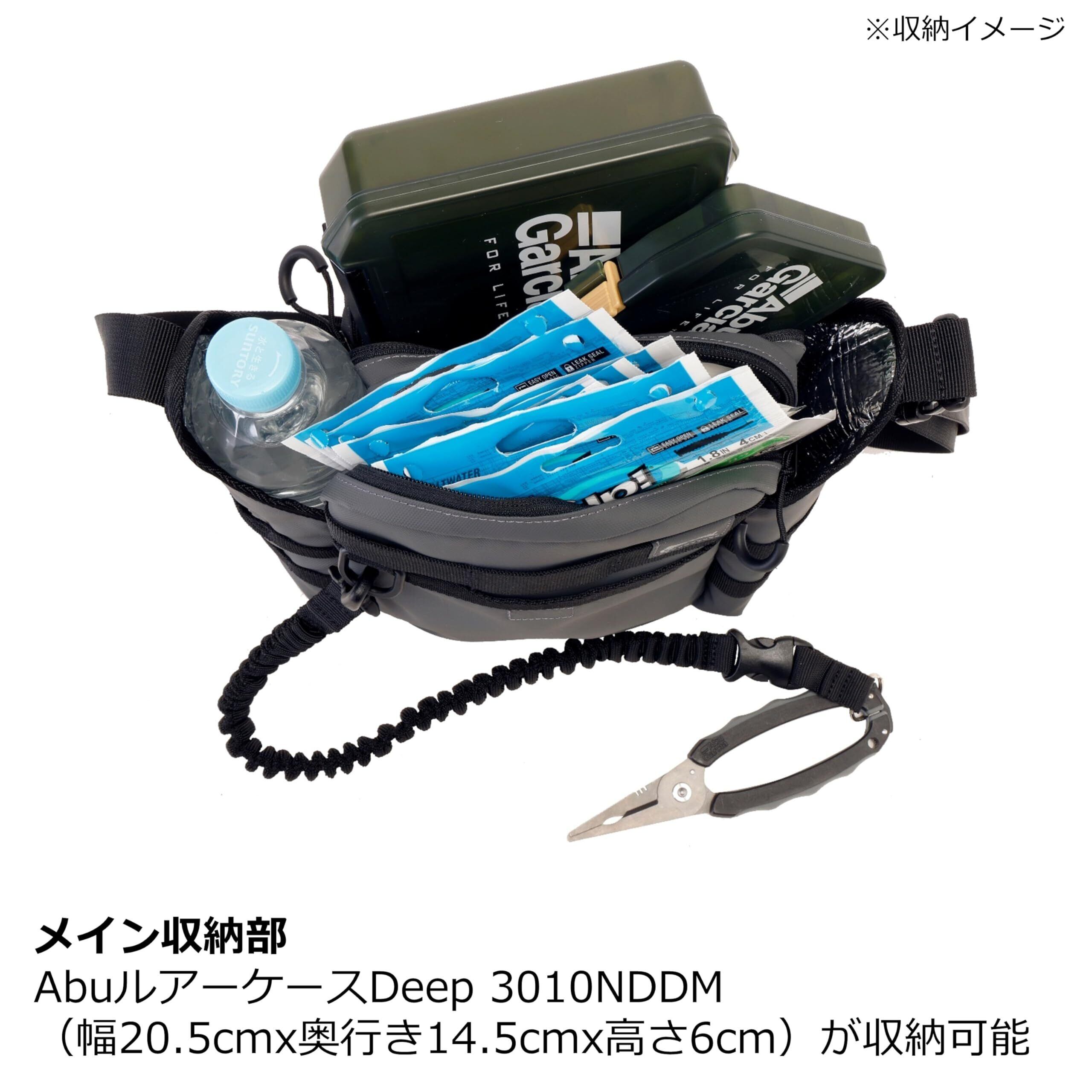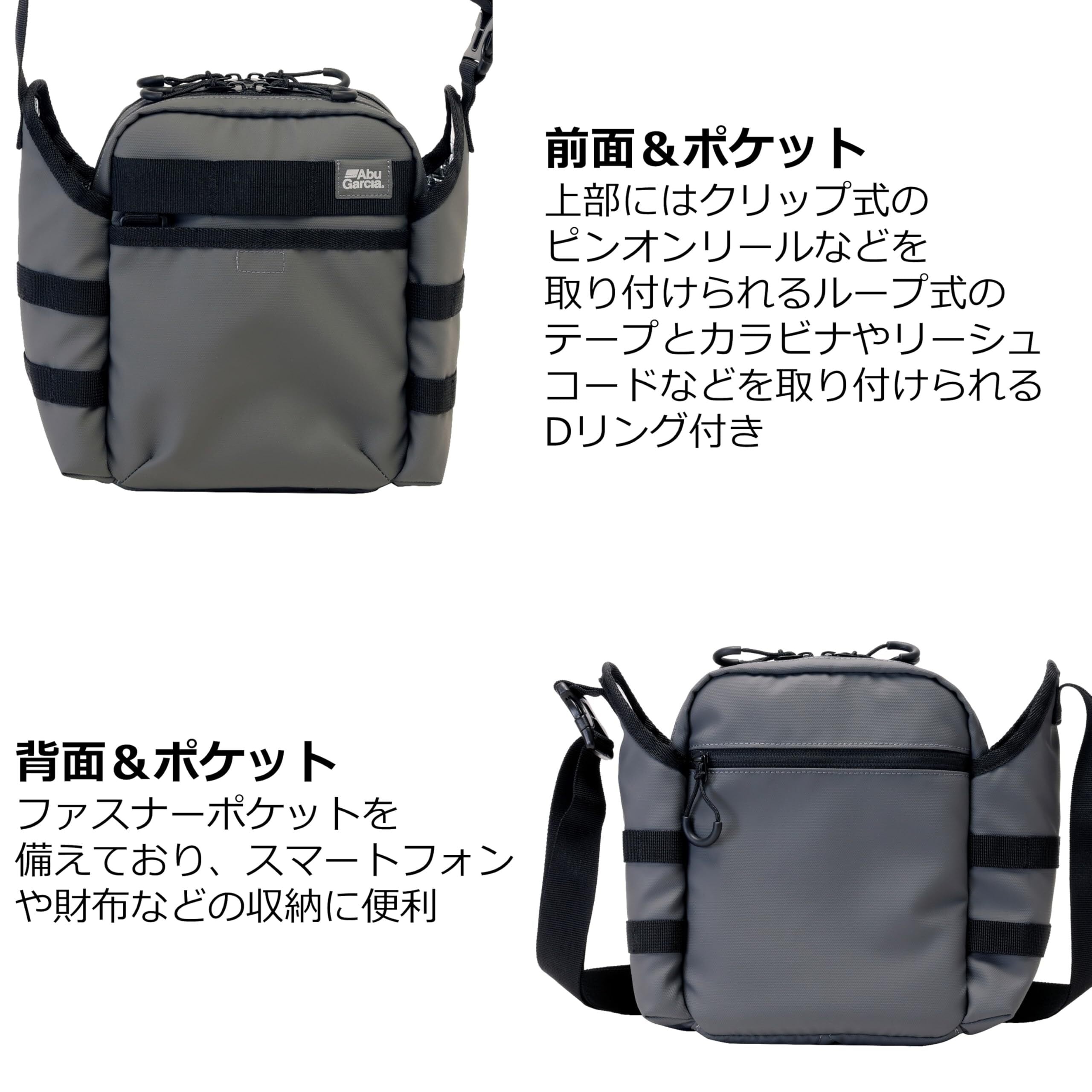 セパレートの収納部でルアーボックスやワーム類を分けて収納可能!<br>両サイドにボトルホルダーを備えたランガン仕様のミニショルダーバッグ!<br>AbuルアーケースDeep 3010NDDM(幅20.5cmx奥行き14.5cmx高さ6cm)が収納可能。<br>フロントにポケットを備え、ポケットの上部にはクリップ式のピンオンリールなどを取り付けられるループ式のテープとカラビナやリーシュコードなどを取り付けられるDリングが縫い付けてある。<br>両サイドにはボトルホルダーを備え、サイドポケットのループには別売のAbu 2way Holderなどを取り付けてカスタマイズが可能。<br>背面にはファスナーポケットを備えており、スマートフォンや財布などの収納に便利。<br>表面コーティング素材で防水性を向上させている。<br>*素材には防水加工を施しておりますが、製品は完全防水仕様ではありません。