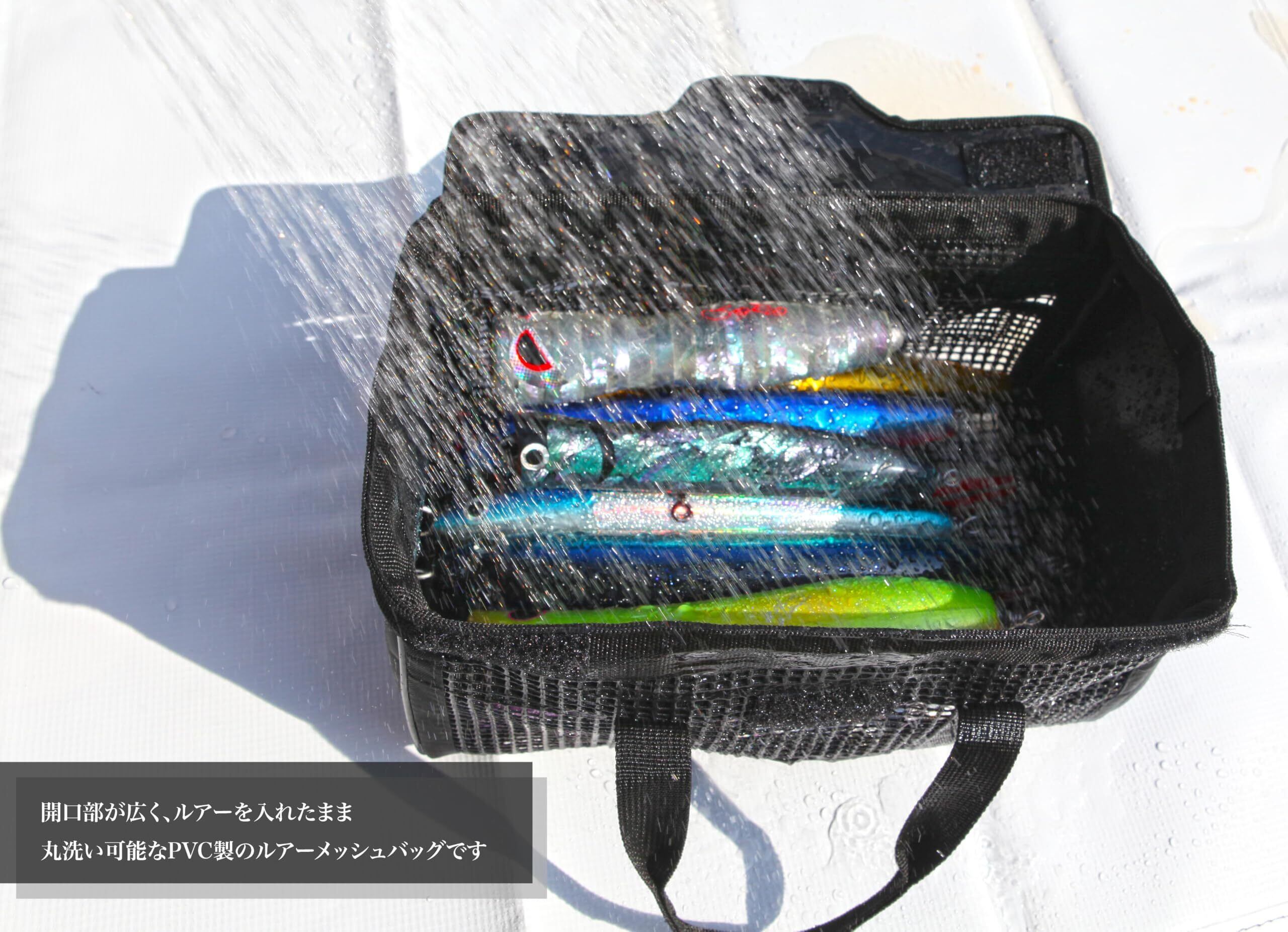 メッシュ素材なので使用後にルアーを入れたまま丸洗いできるPVC製のルアーメッシュバッグです。 3サイズ展開なのでショート・スロージグからロングジグやビッグプラグにも対応します。蓋の上部にはターゲットであるGT、マグロ、カンパチ、ヒラマサのイラストをデザインしました。