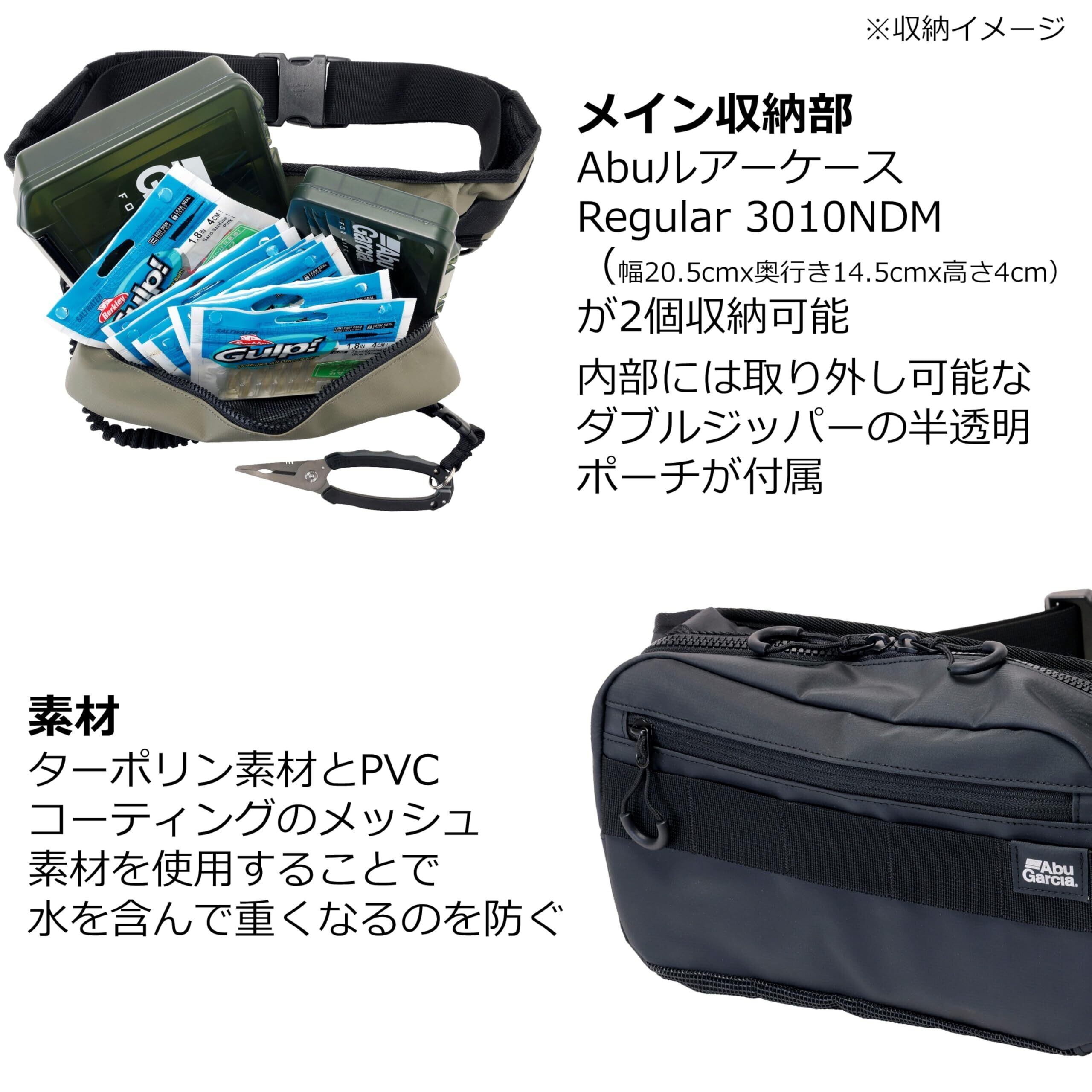 ロックショアゲームやウェーディング、SUPフィッシングなど、水の中に入る機会の多いアングラーに向けた排水機能に特化したヒップバッグ!<br>本体収納部やポケットなどにメッシュ素材を使用し、本体内部に水が入っても排水して内部に溜まらない仕様。<br>本体にはAbuルアーケースRegular 3010NDM(幅20.5cmx奥行き14.5cmx高さ4cm)が2個収納可能。<br>フロントにはファスナーポケット、その下にクリップ式のピンオンリールなどを取り付けられるループ式のテープ、ウエストベルト部にはリーシュコードなどを取り付けられるナスカンとDリングを備えている。<br>内部には取り外し可能なダブルジッパーの半透明ポーチが付属。<br>ターポリン素材とPVCコーティングのメッシュ素材を使用することで水を含んで重くなるのを防ぐ。