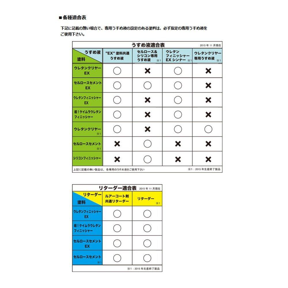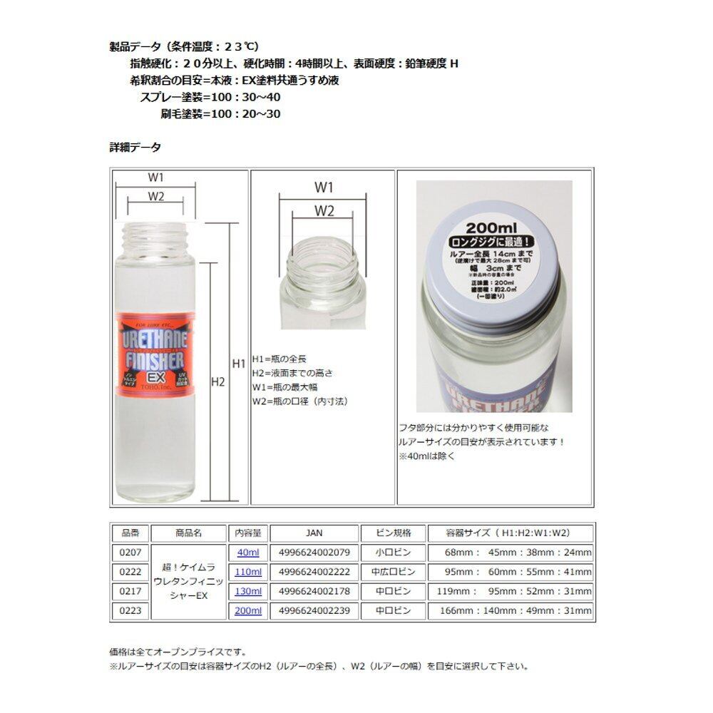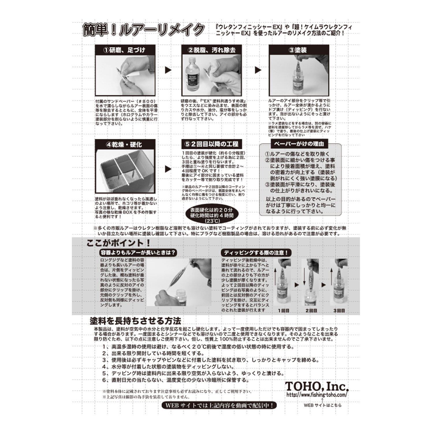 製品特徴 1、ルアーの「超! ケイムラ」チューンと表面補強コーティングが同時に行えます! 2、透明度が高く光沢があり、ホロなどの輝きもそのままでケイムラカラーをプラス! 3、ハードかつ粘りの強いウレタン樹脂を採用したので、キズがつきにくく衝撃にも強 い強靭なウレタントップコーティングを実現! 4、様々なルアーに適したボトル形状が豊富にラインナップされていて使いやすい! 5、トルエン・キシレンを含まないノントルエンタイプ(TXフリー)! 6、UVカット剤配合なので、下地カラーの色褪せなどを防止! 7、「セルロースセメントEX」などと共通のうすめ液なので大変便利! 用途 メタルジグ、プラグ、鯛ラバ、ジグヘッド、テンヤなどのルアーの「超! ケイムラ」カラーチューン、トップコーティング、表面補強塗装にご使用下さい。 本ウレタンは、根ズレなどのキズによる表面保護はもちろんストラクチャーゲーム等で の衝撃によるひび割れもしにくい、強靭な塗膜のルアー専用ウレタンコート剤です! ※市販のルアーは、最低限のトップコーティングしかされてない場合が多く、一度使用し ただけでホログラムやカラー等が剥がれたりする場合があります。そうなる前にコーテ ィングして補強することによりルアーの寿命が大幅にUPします! 製品データ(条件温度:23℃) 指触硬化:20分以上、硬化時間:4時間以上、表面硬度:鉛筆硬度 H 希釈割合の目安=本液:EX塗料共通うすめ液 スプレー塗装=100:30〜40 刷毛塗装=100:20〜30