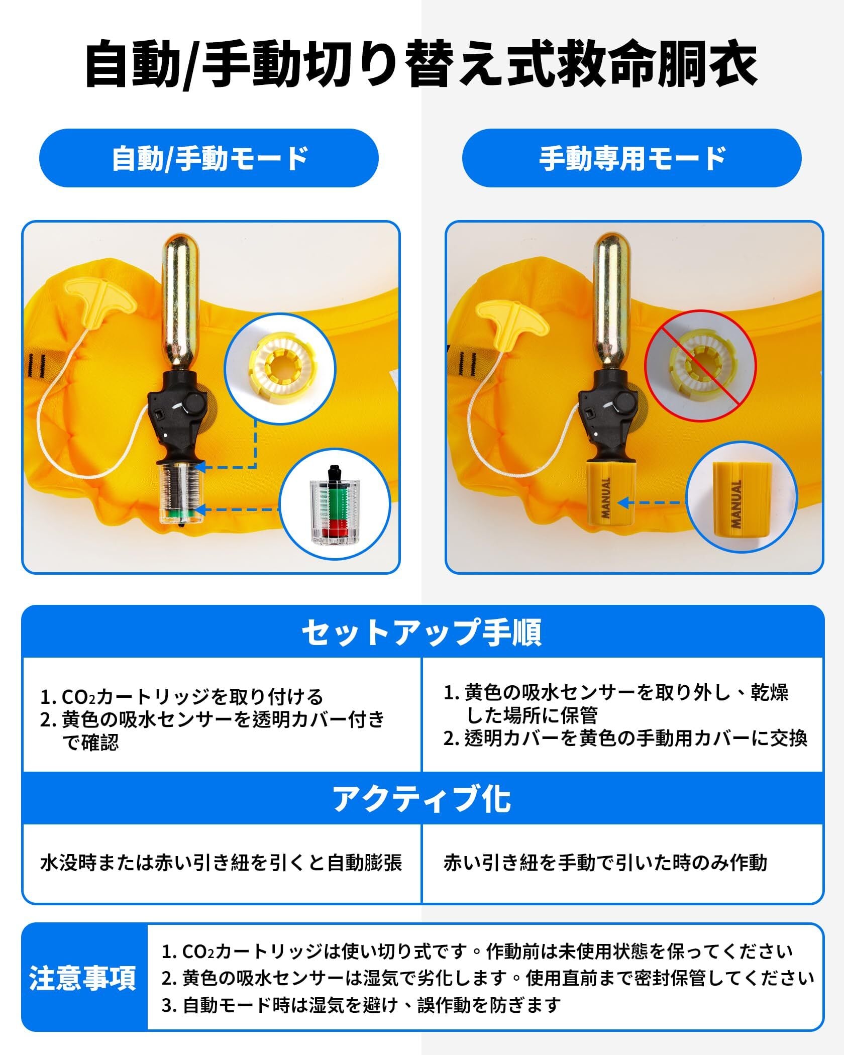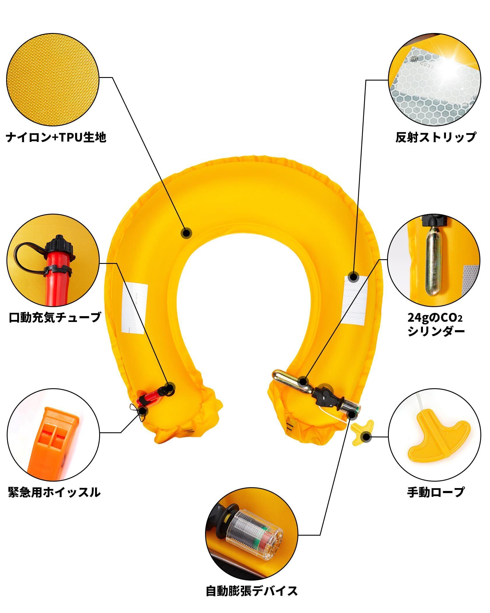 【幅広い用途】この救命胴衣は釣り、川遊び、ラフティング、カヌー、水泳に適しており、津波や台風などの緊急時にも活用できます。このライフジャケット釣り用モデルは国土交通省の基準に準じた設計ですが、残念ながら日本国土交通省の認可は得られておらず、船舶検査には使用できません。しかし、安全性は確保されており、有効な支援を提供します。Owntopの自動膨張式ライフジャケットにはガスボンベキットが同梱されています。問題のある商品をお買い上げの場合は、すぐにお問い合わせください。迅速な物流で新商品をお送りします。
