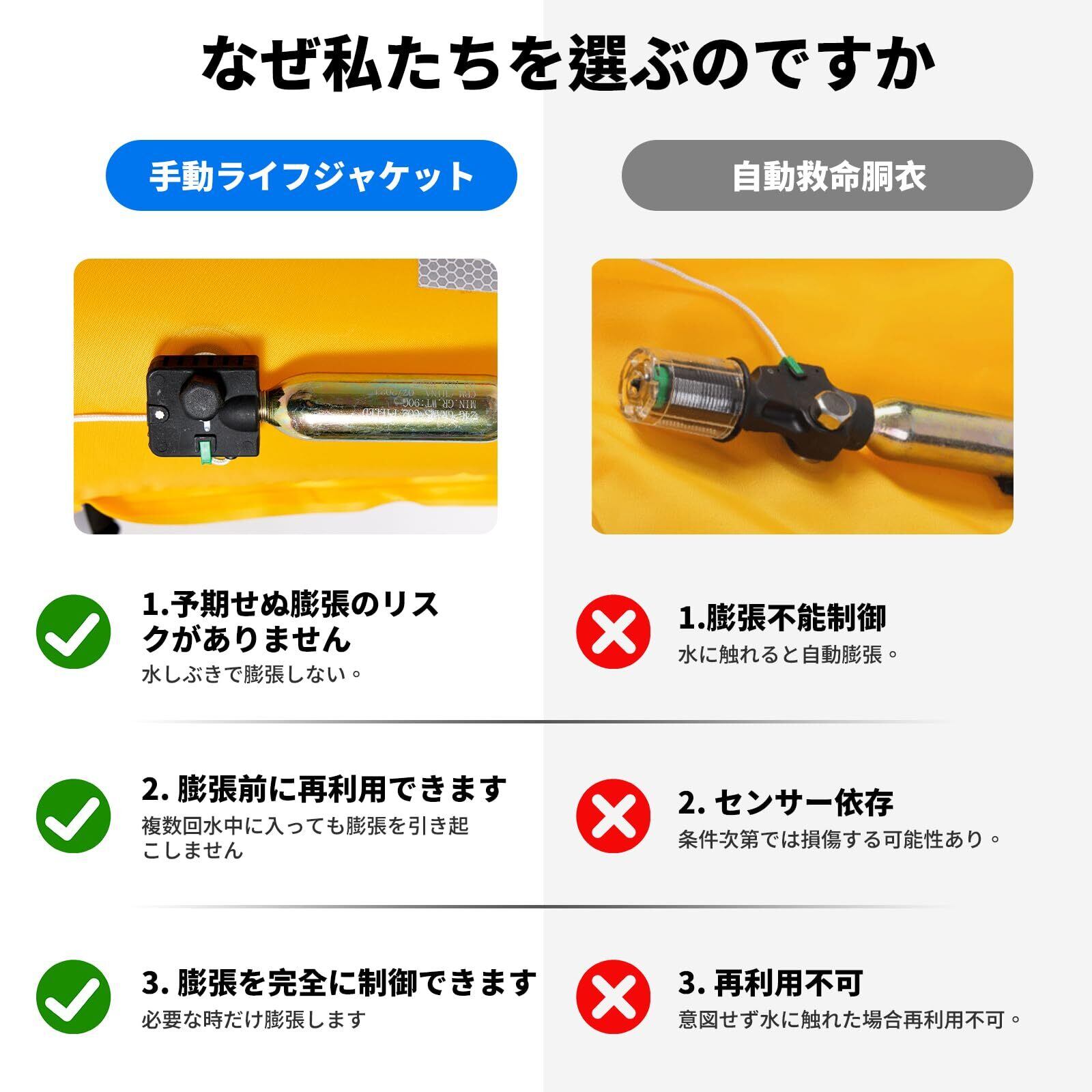 【手動膨張式・急速膨張】緊急時にはライフジャケットの紐を引くだけで、3〜5秒で急速に膨張し、水面に浮上します。フジャケット 手動膨張式は雨や波しぶきに濡れても誤って作動することはありません。充気前に繰り返し使用可能で、水上活動に支障をきたしません。 救命胴衣 釣り