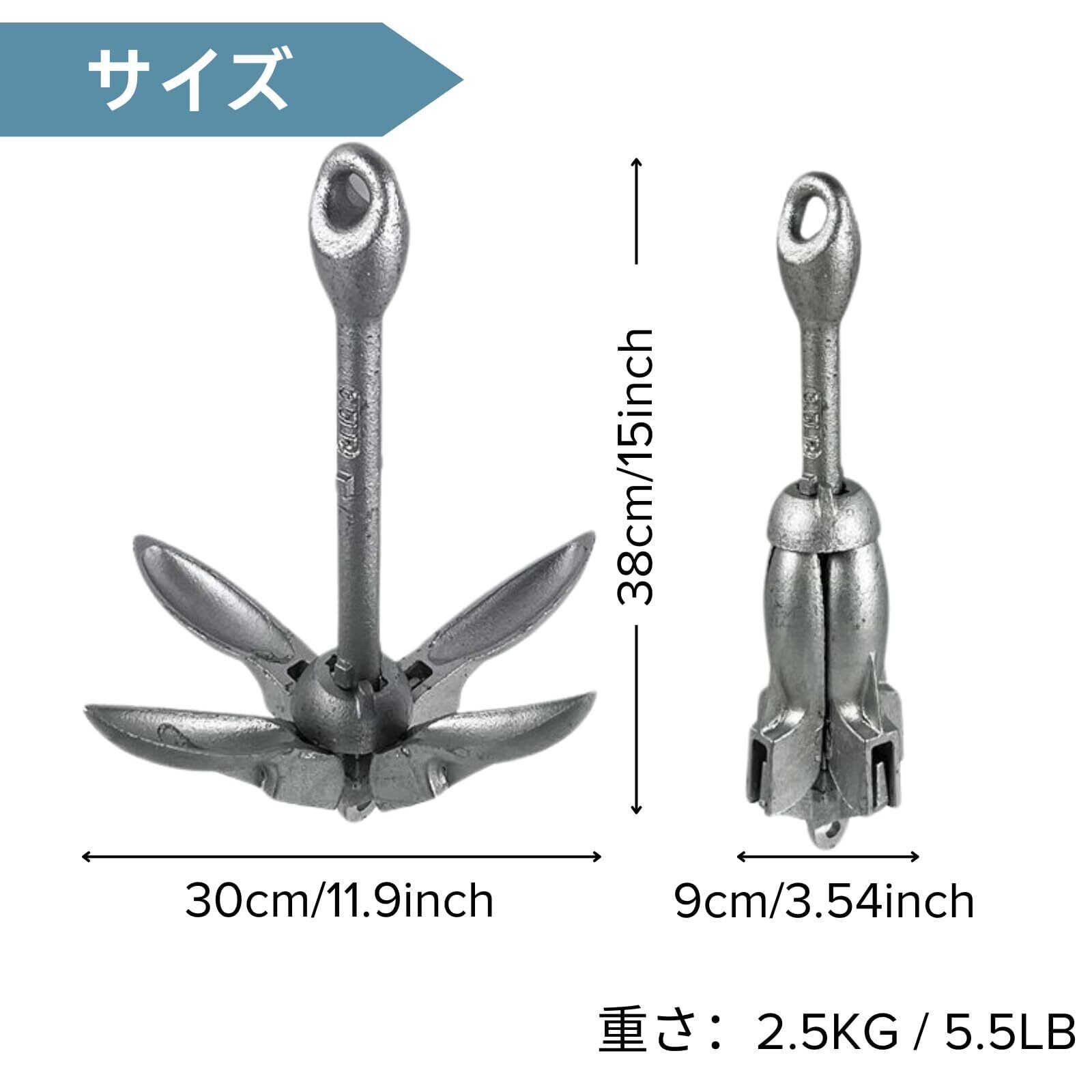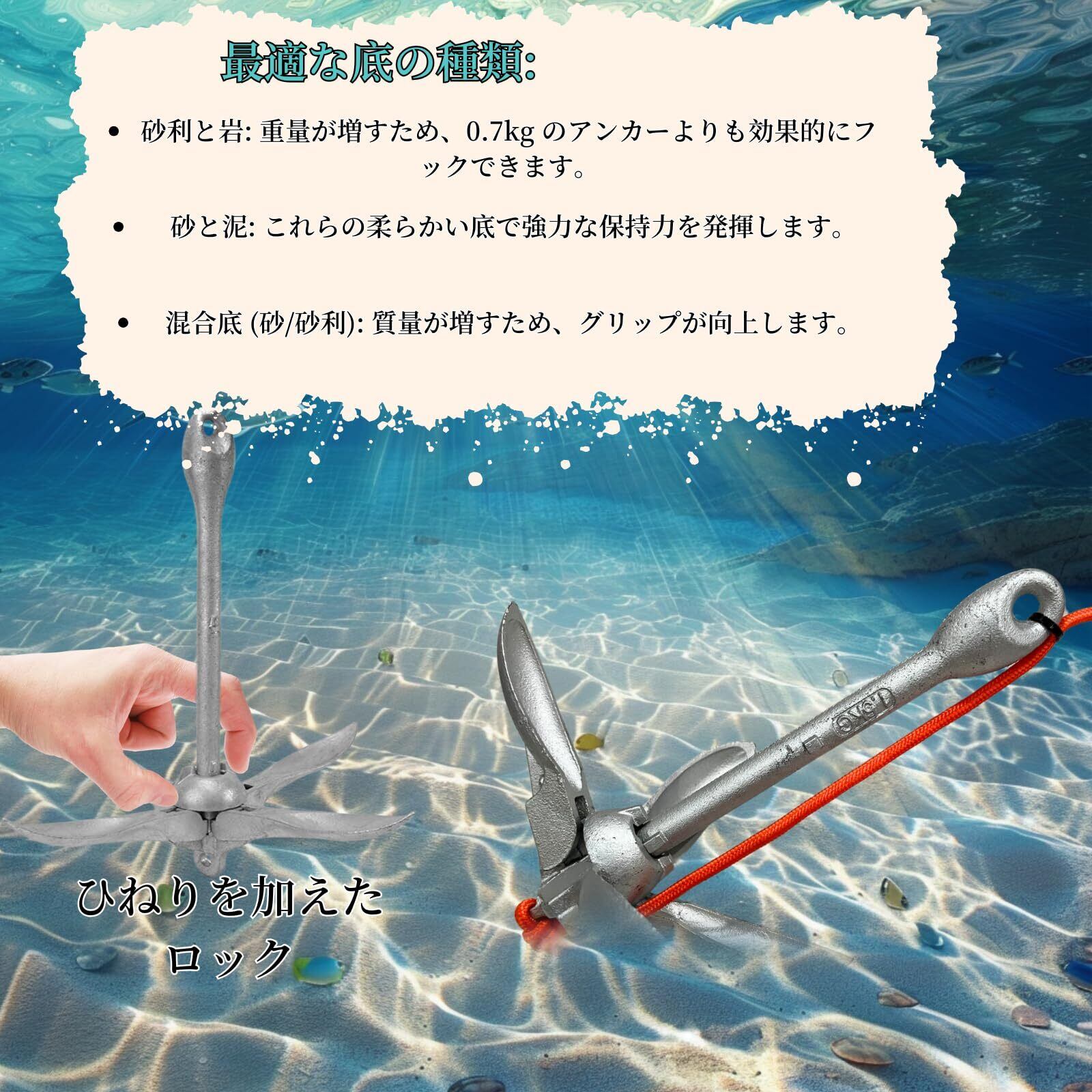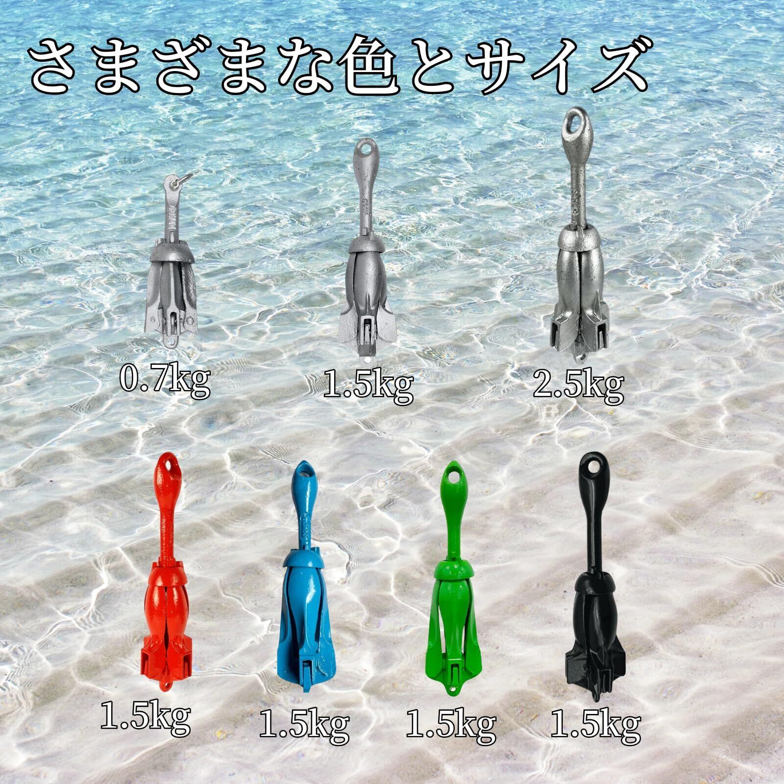 【アンカー 海 - 選べる豊富なサイズ】 当店の折りたたみりたみアンカーは、0.7kg、1.5kg、2.5kgの三つのサイズをご目的としています。お客様の目的や船のサイズに合わせてお選びいただけます。 0.7kg:浅い湖(1~3メートル)カヤック、カヌー、小型ゴムボートなどに適しています。 1.5kg:中深海(約3~7メートル)フィッシングボート、小型のレジャーボート、ポンツーンボートなどに適しています。 2.5kg:深海および大きな湖(約7~15メートル)大きなレクリエーションボート、中型のヨット、より重いフィッシングボートなどですなどに適しています。