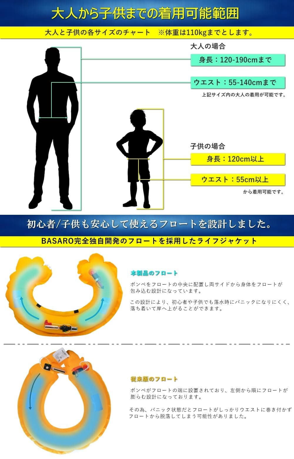 JES-BASARO (ジェスバサロ) 自動膨張式 ライフジャケット 救命胴衣 自動/手動双方対応モデル 2Wayモデル 釣り 大人用 子供 腰巻き 腰 ベルトタイプ 日本国内メーカー B-Life-Jac-LC-MN/AT 日本語取扱説 CO2ボンベ搭載