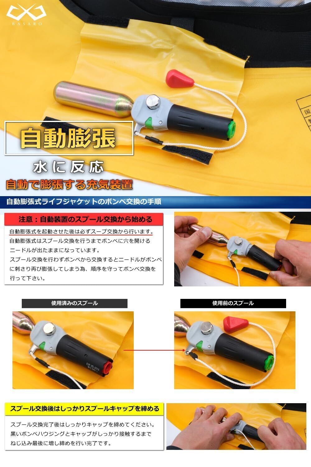 本製品は自動膨張式専用ボンベキットとなっております。交換用ボンベ/充気装置安全ピン/スプール(水感知)がセットになっております。ボンベ交換の際はキットに付属しているパーツすべてを交換してください。