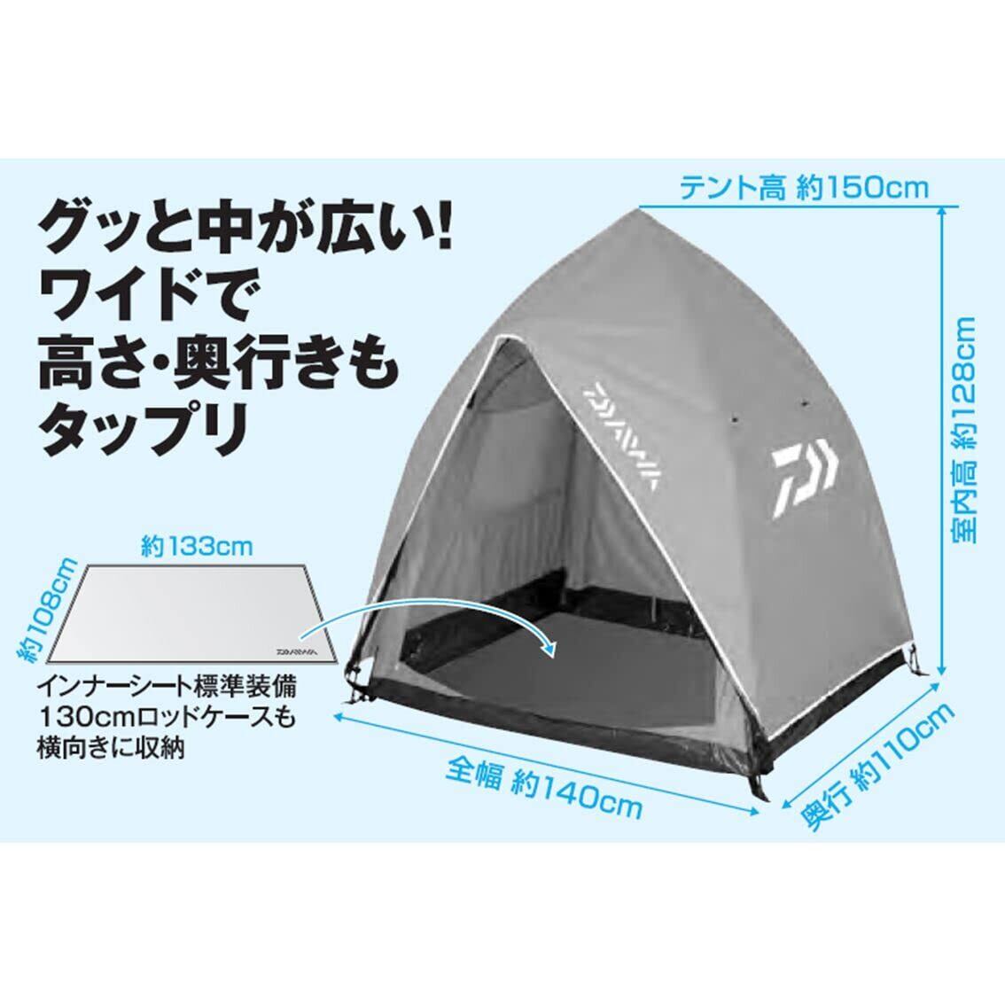 開口部からの雨などの浸入を防ぐ折りたたみ式ひさし付き / 熱気がこもりにくいメッシュ天窓 / 専用ターポリンインナーシートを標準装備 (約108*133cm) / 出入りしやすいリアファスナー式出入口