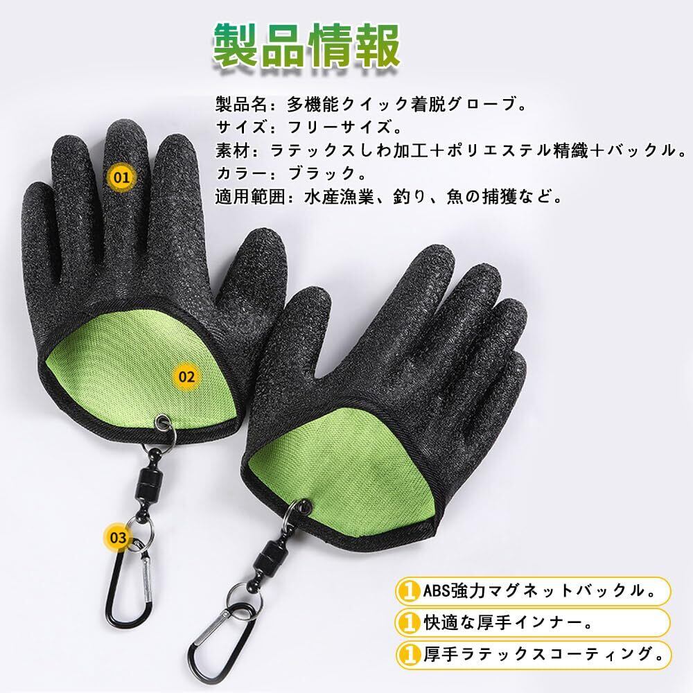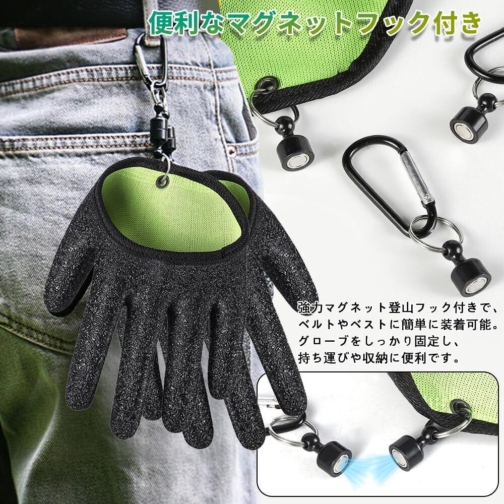 【商品仕様】 内容:釣り用グローブ1双+マグネット登山フック サイズ:約19cm 素材:ラテックス(しわ加工)+ポリエステルニット+スナップファスナー