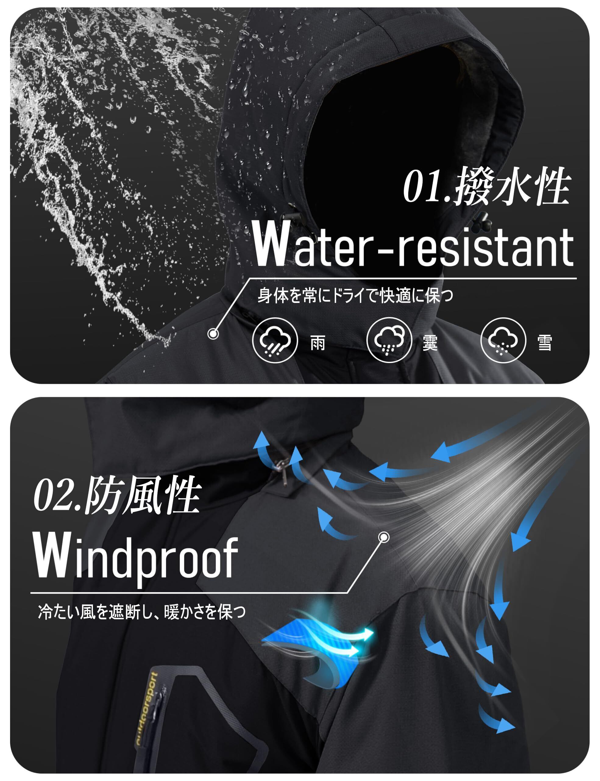 【機能】 1.【撥水性】生地の表面で水を弾く機能のこと。水分が生地についたときに、コロコロと転がり落ちて生地が濡れにくくなる、多少の雨や雪を弾くことができます。 2.【保温性】保温性に優れているため、帽子と袖口の設計も保温性を強めます