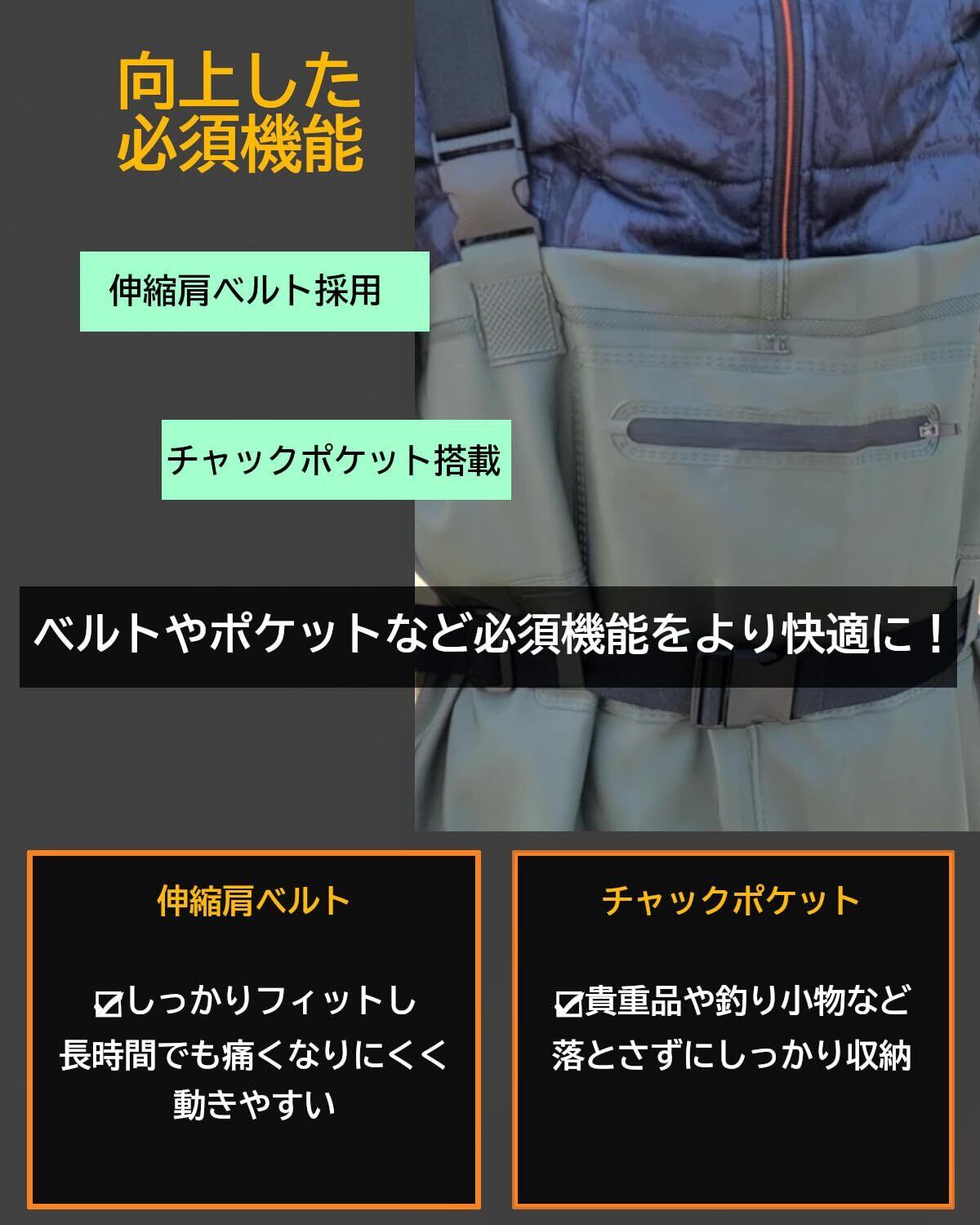 【進化したベルト】肩ベルトと腰ベルトを伸縮素材にすることにより、動きやすく長時間の着用でも痛くなりにくい!肩ベルトはH形のサスペンダーでしっかりフィットし調整も可能。腰ベルトももちろん調整可能で様々な体型でも動きやすくしっかりフィットで安心安全!