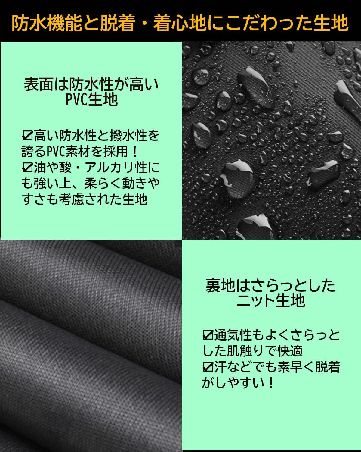 【防水性と着心地にこだわった生地】 表地はPVC・裏地はニット生地を使用しており防水性とともに中の湿気を排出可能な機能性素材。表地は高い耐水性・撥水性と油や酸・アルカリにも強く防寒性もあり、柔らかく動きやすさも考慮された生地。裏地のニット生地は蒸れにくく、さらっとした肌触りで素早く脱着が可能。多少気温が高くとも快適に使用する事ができます。