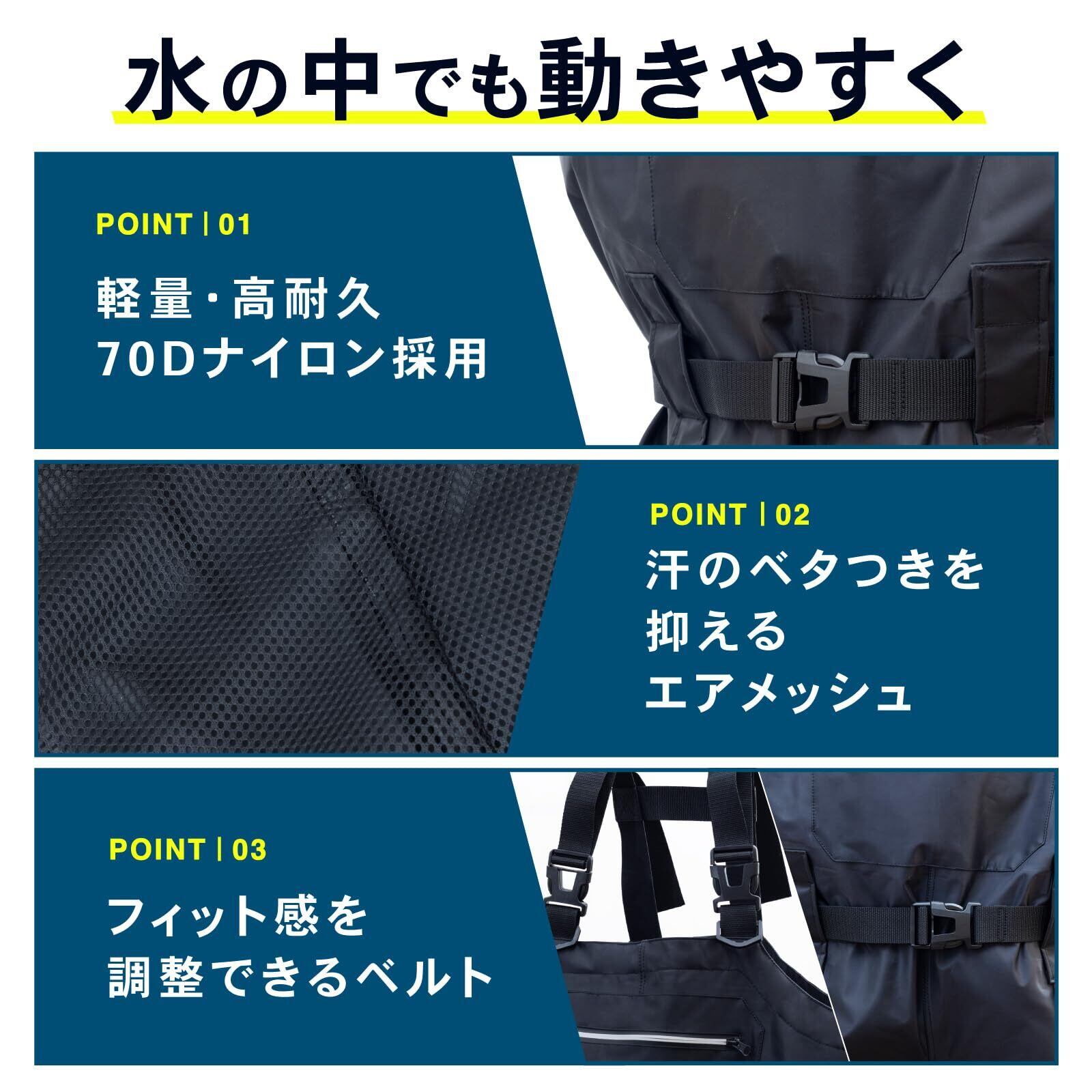 【さらに釣果をあげるこんな機能も!】ロゴにはリフレクター素材を採用することで、夜間でも光が反射して目立つため居場所がすぐに分かり安心です。肩と腰のベルトで体へのフィット感を調整できるので、体に密着し水の抵抗が少なくなり動きやすくなりました。