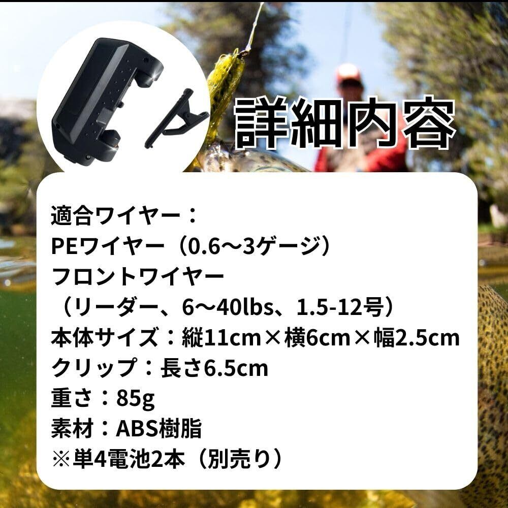 ◆適合ワイヤー:PEワイヤー(0.6~3ゲージ)、フロントワイヤー(リーダー、6~40lbs、1.5-12号)/縦11cm×横6cm×幅2.5cm/リールクリップ:長さ6.5cm/重さ:85g/素材:ABS樹脂/単4電池2本必要(別売り)