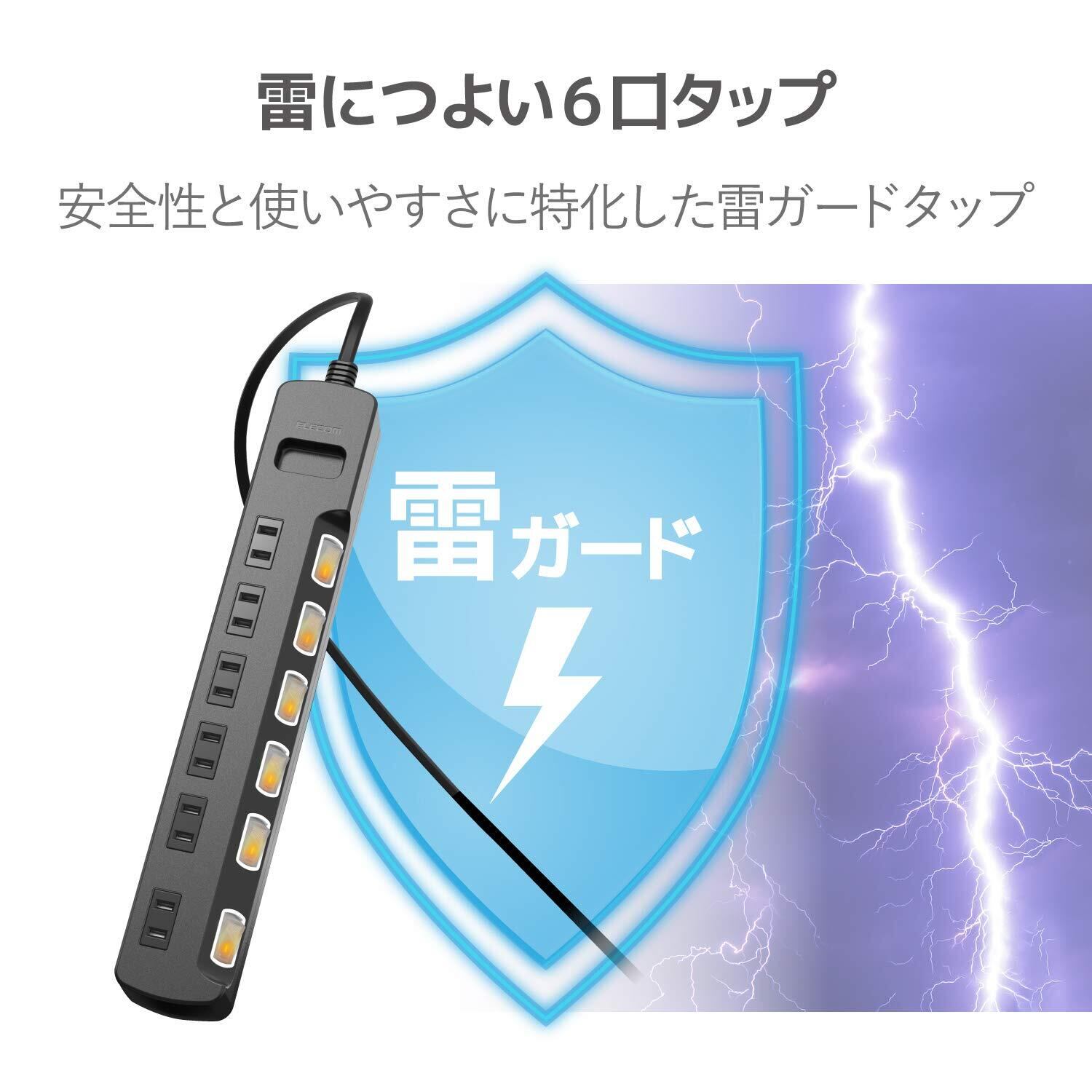 エレコム 電源タップ 6個口 3m 雷ガード 個別スイッチ ほこりシャッター付 耐熱 PSE技術基準適合 ブラック T-K6A-2630BK
