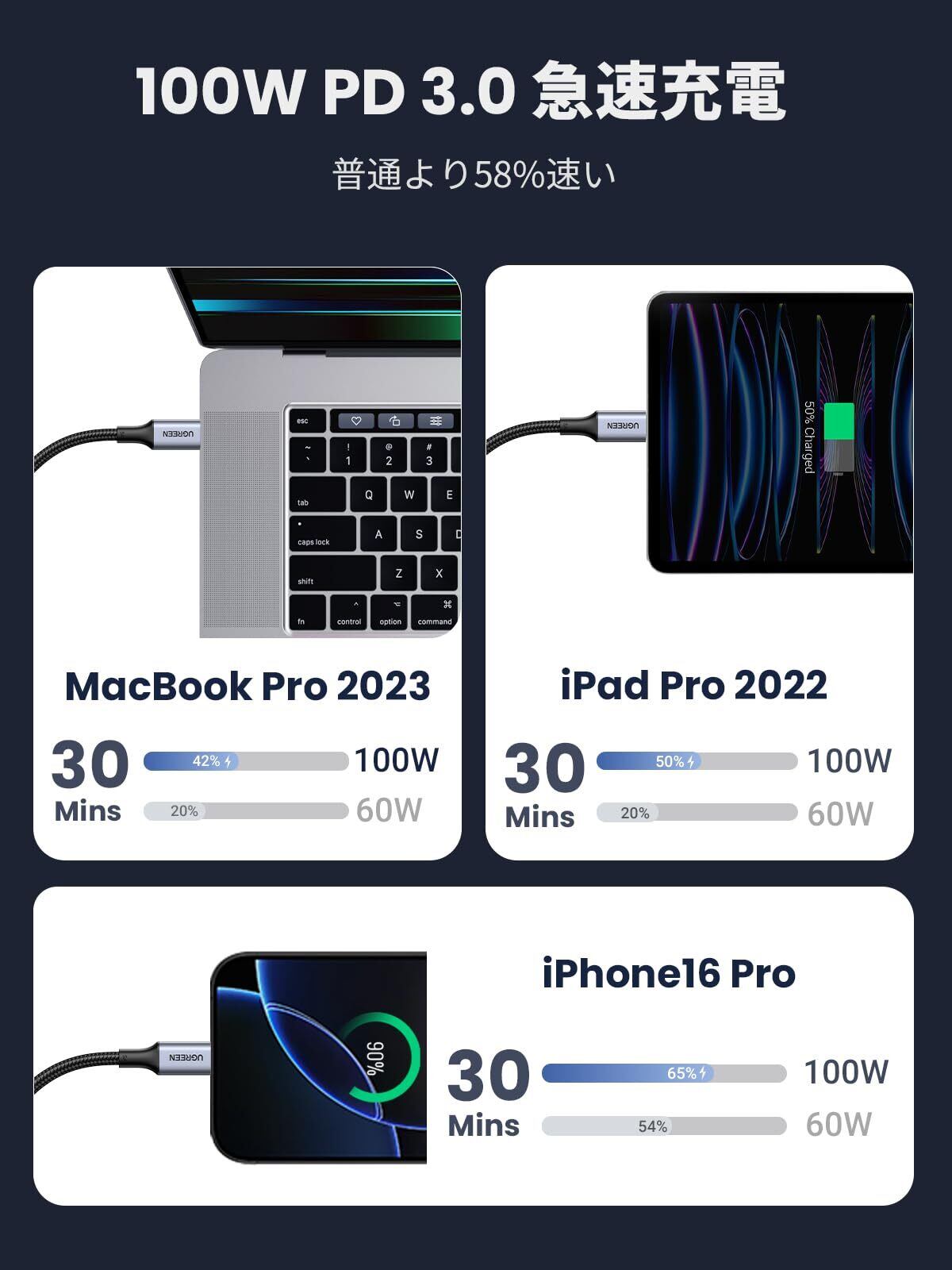 【幅広い互換性】 UGREEN usbc ケーブルはiPhone 17/16/15シリーズ、MacBook Pro、Macbook Air、iMac、ChromeBook Pixel 、Dell XPS 、Moniteur 4k、 Galaxy S24、 Mate 20/ Mate 20 Pro/ P20/ P20 Pro/ Mate 10/ P10、HTC U11/ 10など様々なUSB type cデバイスに対応できます。スマホだけでなく必要の充電時間を短縮したい各種のタブレット、ノートパソコンなどの充電時間を大幅に減らせます。