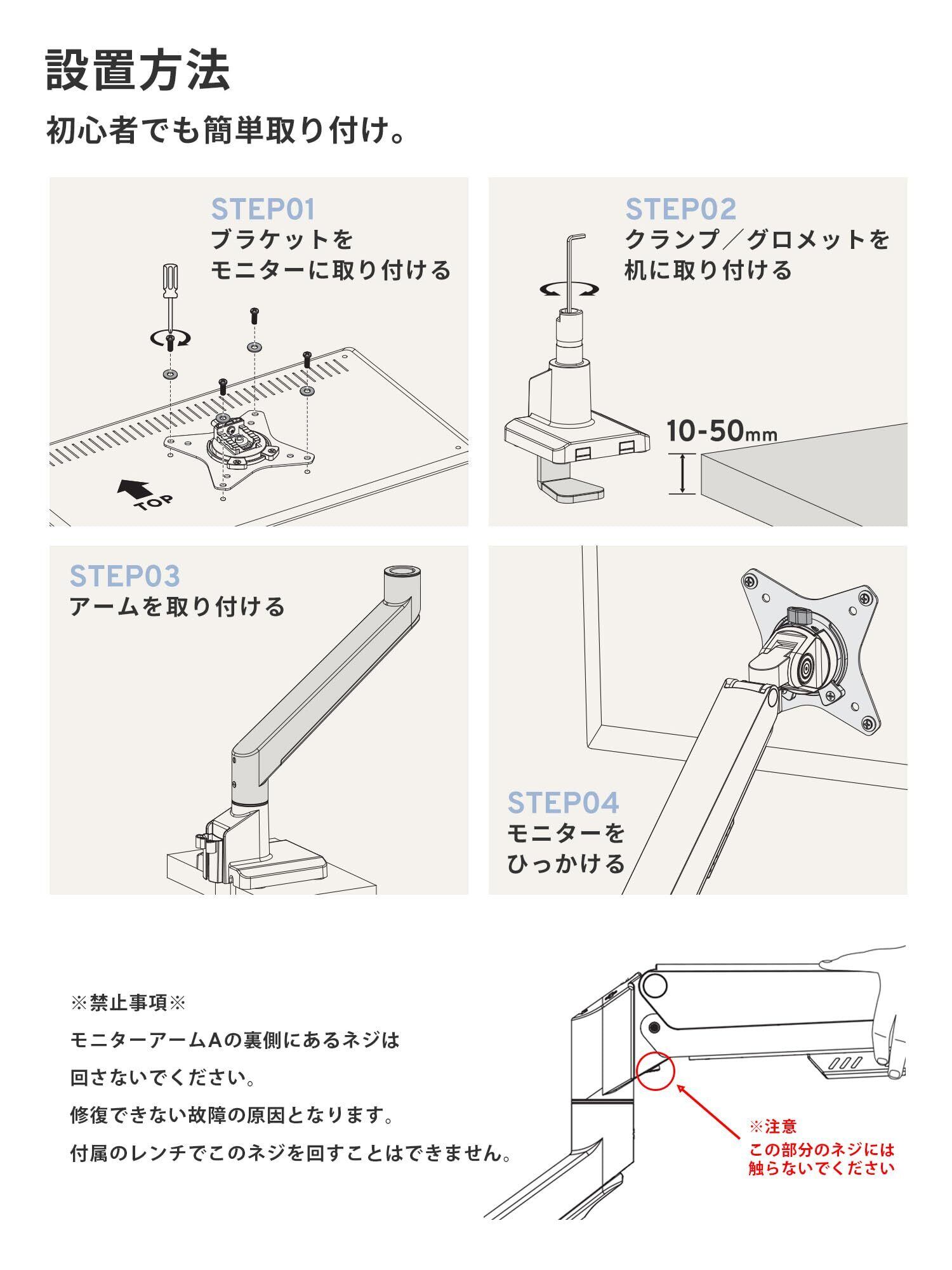 [組み立てのポイント]モニターを取り付けた状態で、アームが水平になるように(アームが下がってくる場合は反時計回り、上がってくる場合は時計回りに)調整ネジを回してください。
