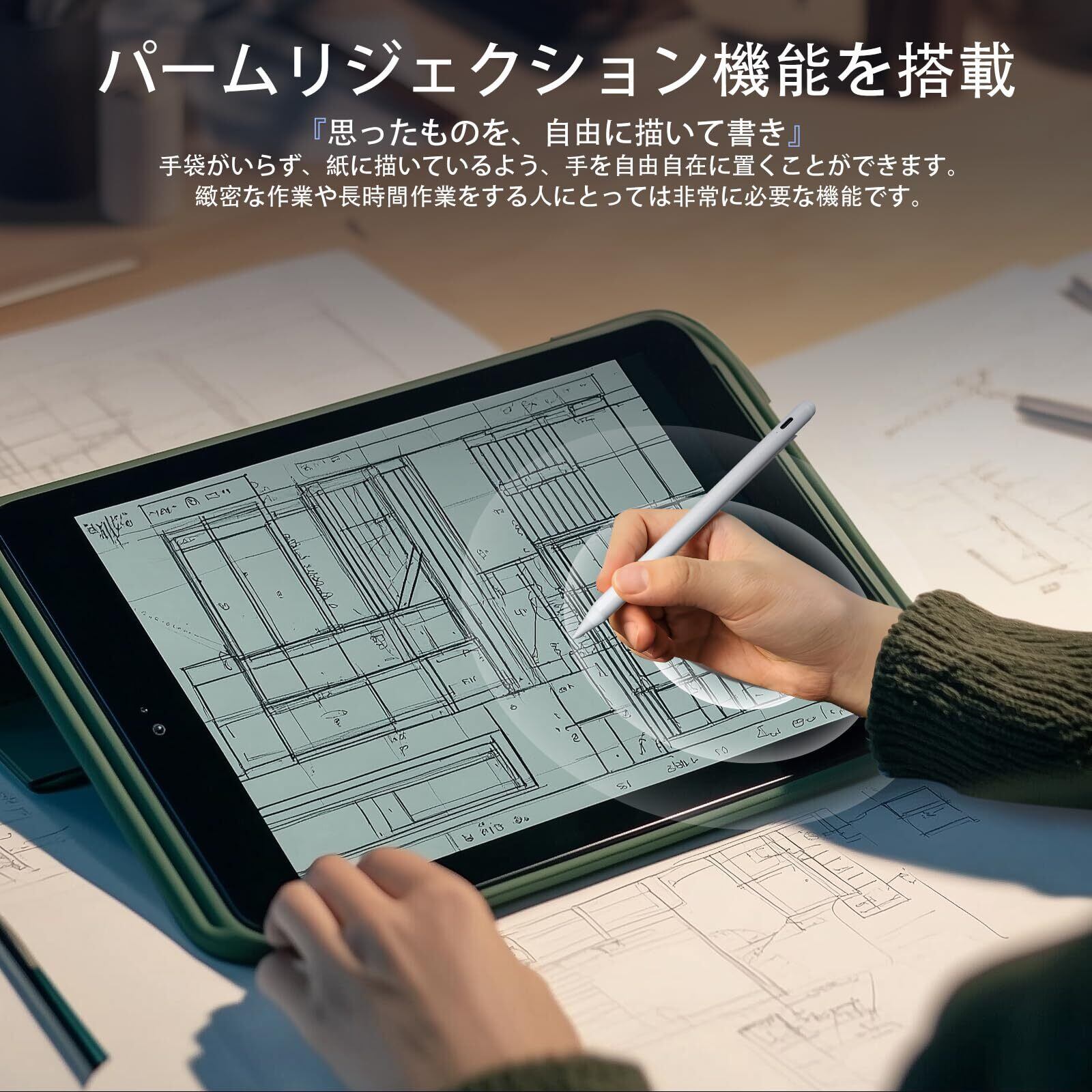 「二重強固磁気吸着&パームリジェクション」JAMJKE iPad用タッチペンは、二重強固磁気吸着機構を採用し、いつでもどこでも安全に使用できます。ノートを取ったり、スケッチのアイデアを練ったりする際に、紛失や置き忘れを心配することなく、便利且つ迅速に作業を行えます。また、パームリジェクションという機能が搭載されていますので、手袋がいらず、紙に描いているよう、手を自由自在に置くことができます。