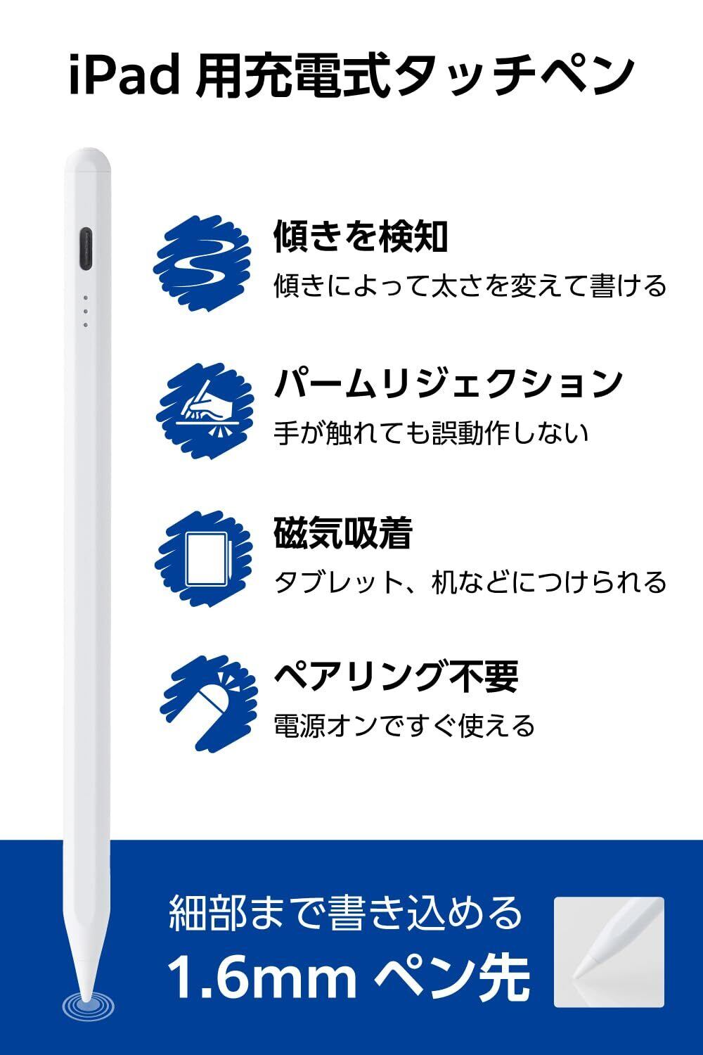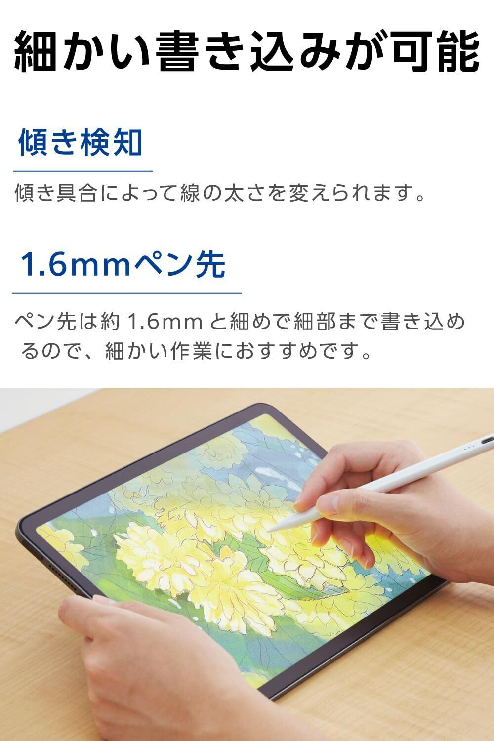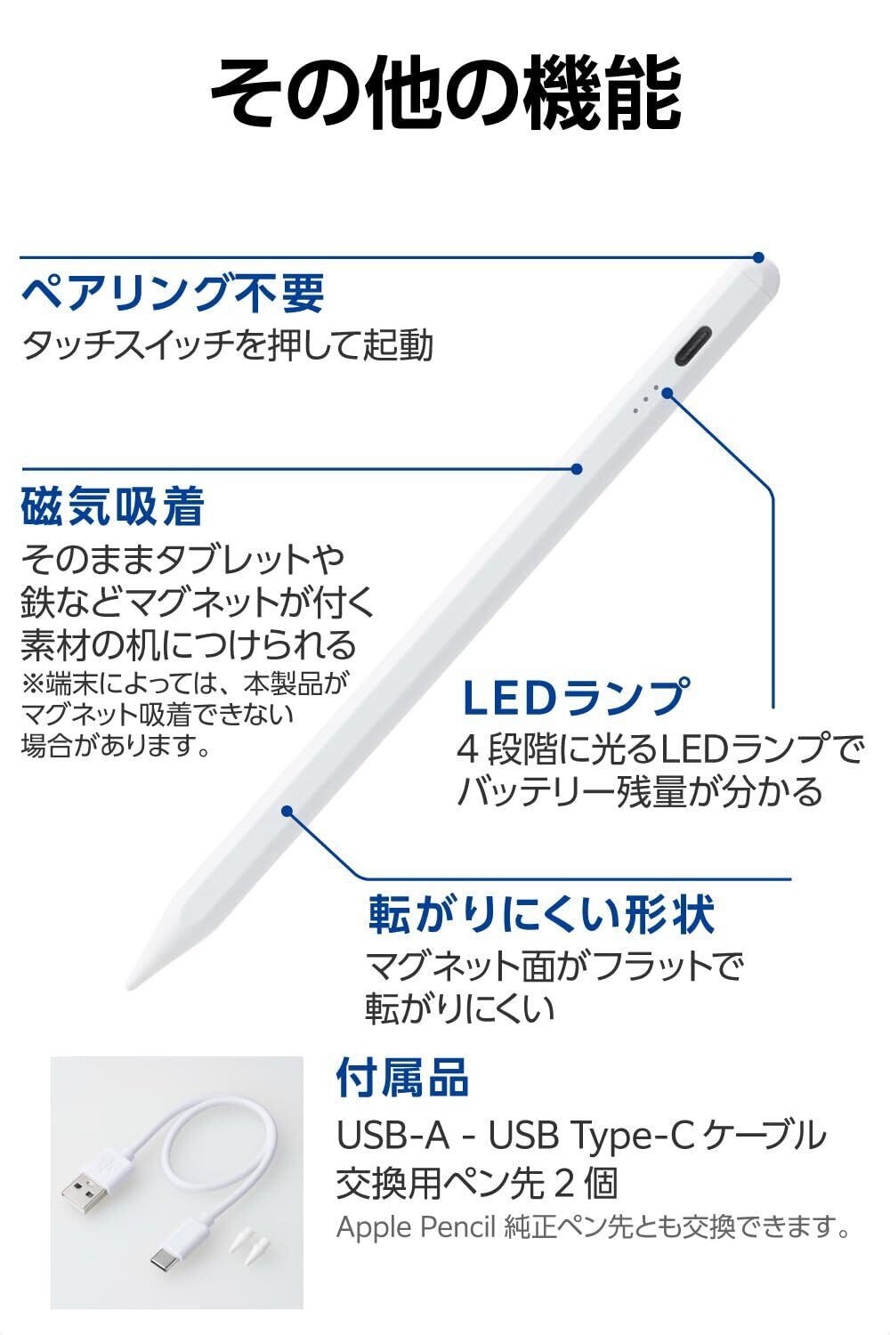 エレコム タッチペン 【11インチ(A16)、 iPad7/8/9/10、iPad Pro 11/12.9/13インチ、Air 11・13インチ(M3, M2)、mini5/6に対応】 iPad専用 ペンシル 急速充電 パームリジェクション 傾き検知 20分でフル充電 P-TPACSTAP07WWH