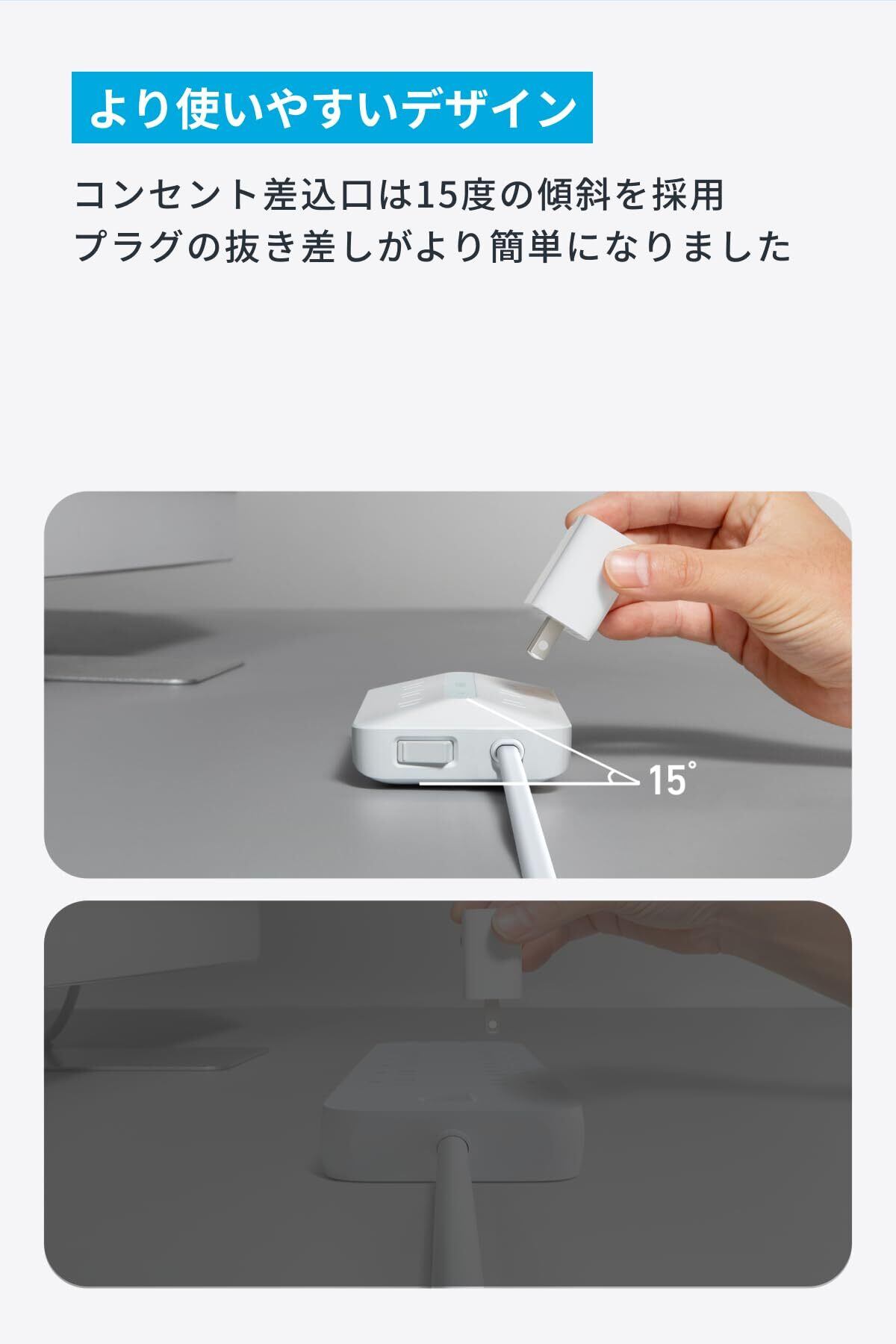 より使いやすいデザイン:コンセント差込口部分には15度の傾斜を採用。プラグの抜き差しがより簡単になりました。