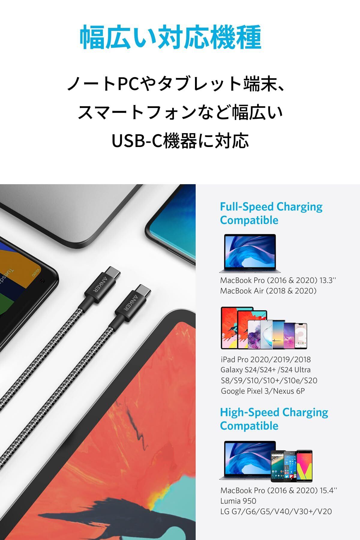 幅広い対応機種:Anker 高耐久ナイロン USB-C&USB-C 2.0 ケーブルは、スマートフォンやタブレット端末、ノートPCなど幅広いUSB-C対応機器に対応しています。