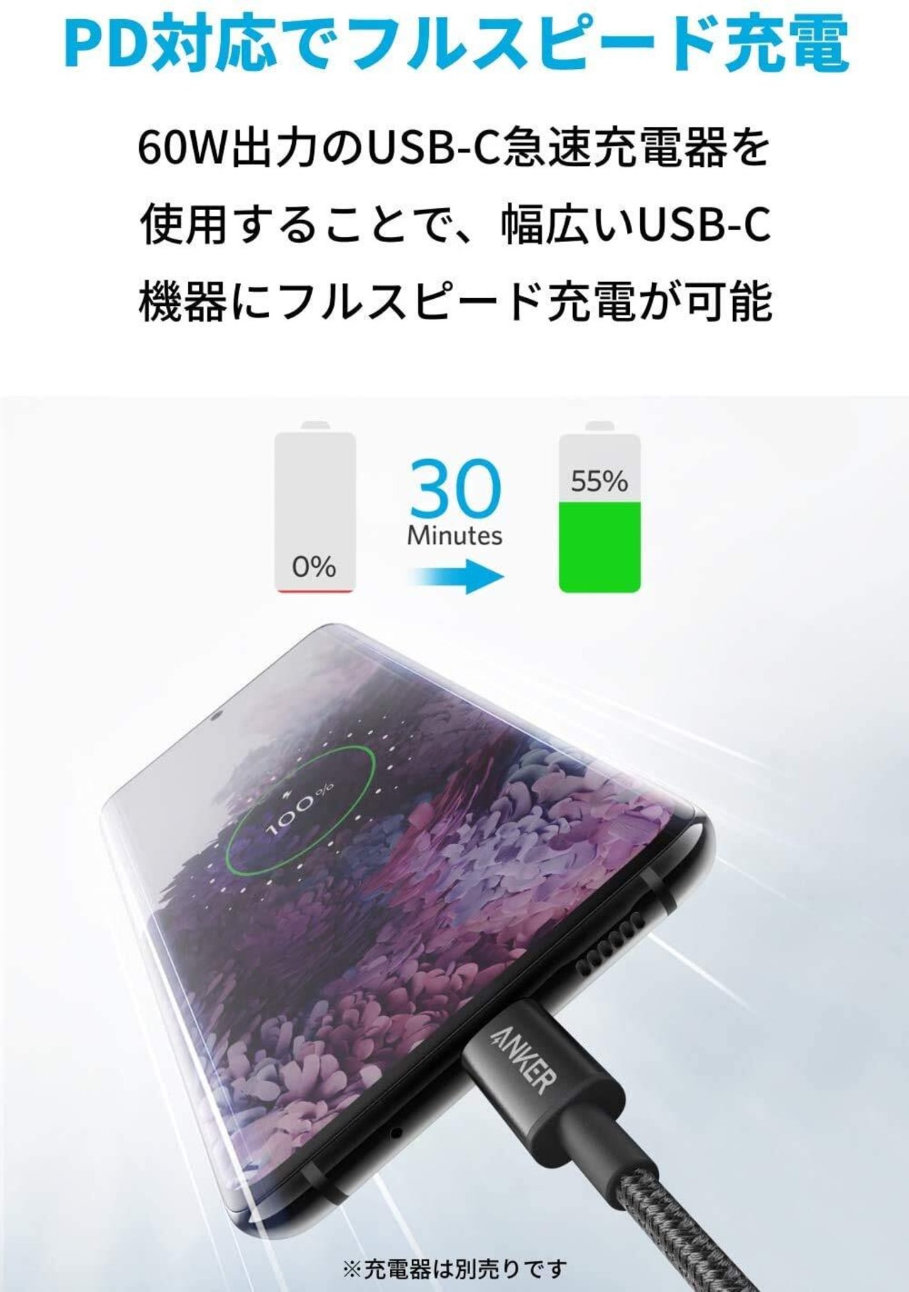 PD対応でフルスピード充電:60W出力のUSB-C急速充電器を使用することでお使いのスマートフォンやタブレット端末、ノートPC等のUSB-C機器にフルスピードで充電できます。(充電器は別売です)