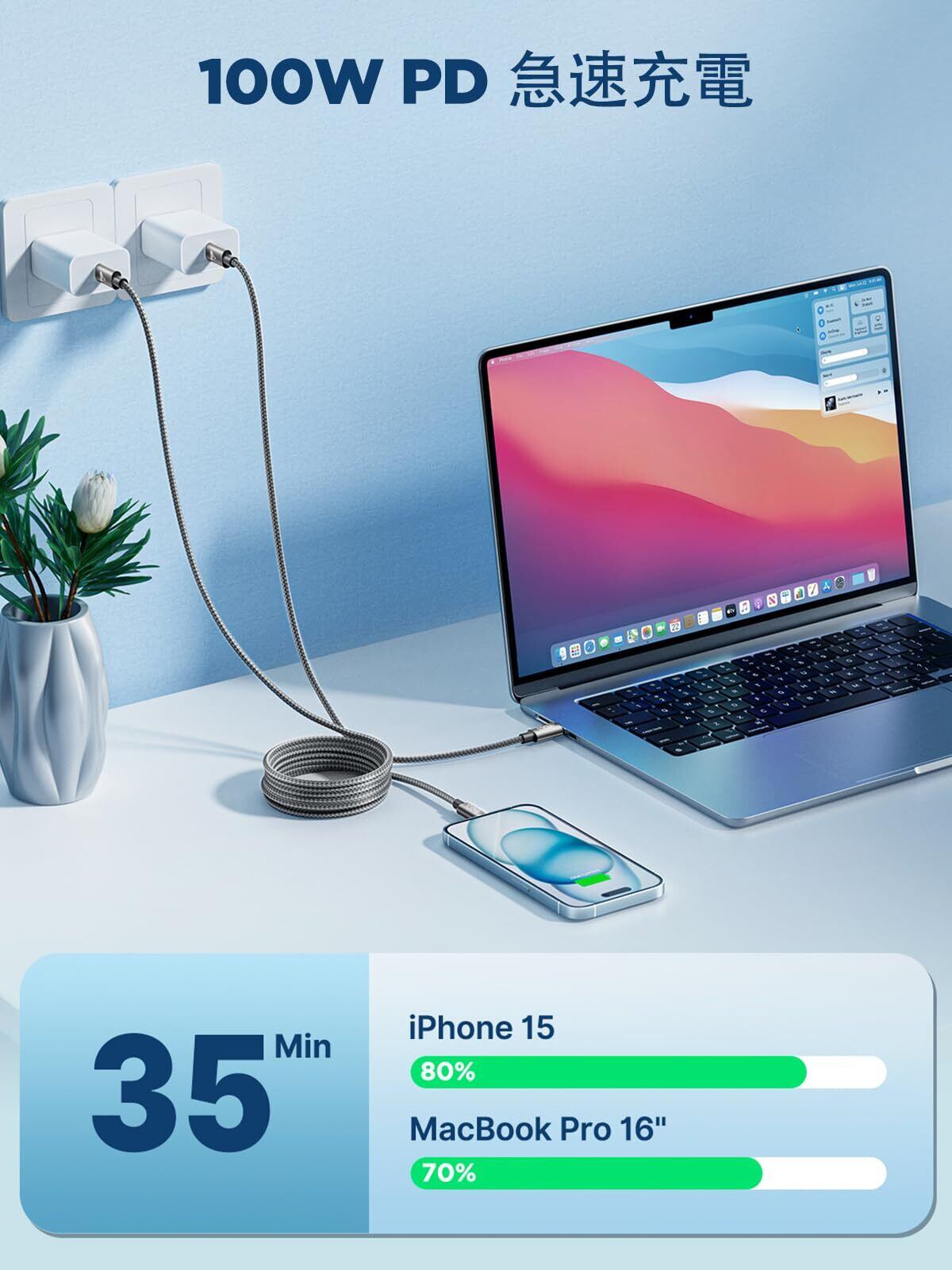 【幅広い互換性】: 本製品は100W対応のUSB type-c to USB-C(CtoC)ケーブルです。USB-C充電器と併用することで、iPhone16 / iPhone16 Plus / iPhone16 Pro / iPhone16 Pro Max / iPhone 15 / 15 Plus / 15 Pro / 15 Pro Max、iPad Pro(第3世代以降)、iPad Air(第4世代以降)、iPad mini(第6世代)、iPad(第10世代)のほか、Xperia、Samsung Galaxy、Huawei、Zenfone、AQUOSなどのAndroidスマートフォンや、USB-C給電対応のノートPCなど、さまざまなデバイスに高速充電が可能です。