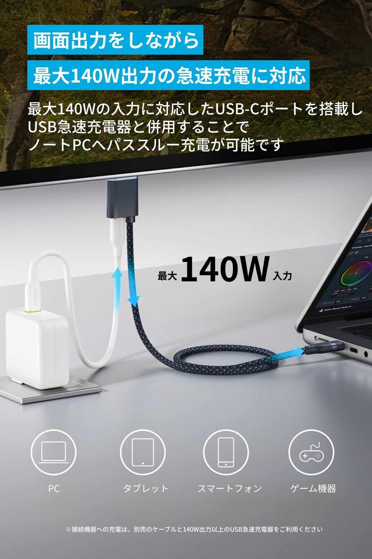 画面出力をしながら最大140W出力の急速充電に対応:最大140Wの入力に対応したUSB-Cポートを搭載しUSB急速充電器と併用することでノートPCへパススルー充電が可能です