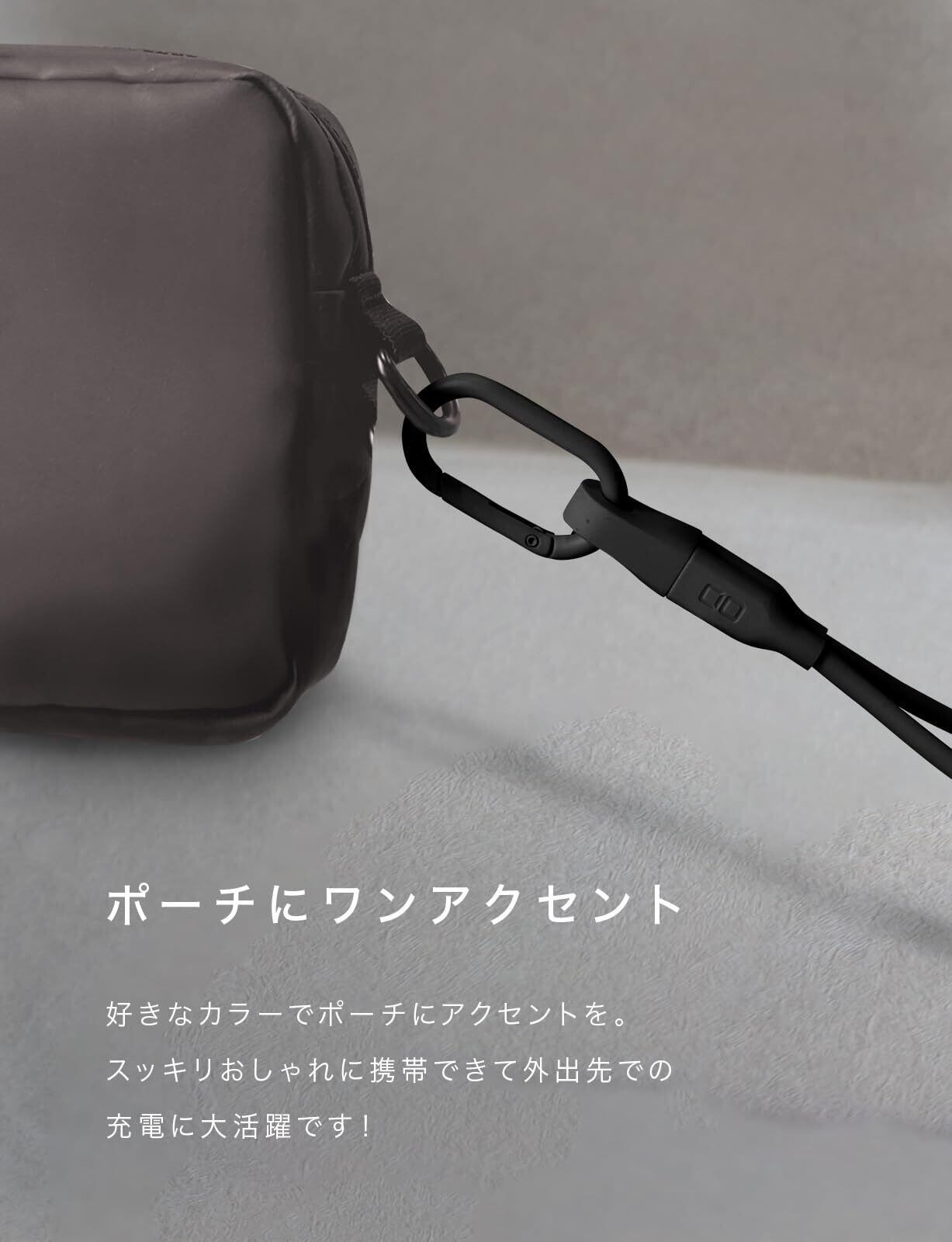 例えばiPhone や android スマートフォンのバッテリー残量が少なくなった際にモバイルバッテリーで充電したり、カフェなどで充電器からノートPCを充電する、といった際に備え、ケーブルをホルダーに取り付け、カラビナでいつものバッグやポーチに引っ掛けておくだけ。