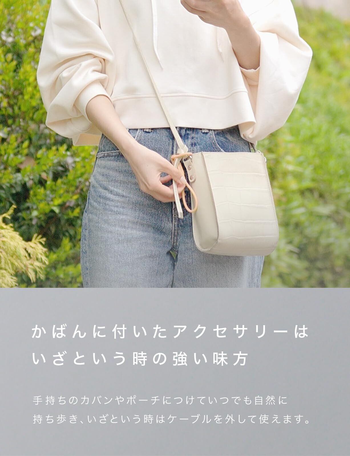 いつものバッグに常につけて持ち運び、モバイルバッテリーや充電器を使う際にさっと取り外し、使い終わったら今度はホルダーに差し込むだけです。ケーブルの持ち忘れや紛失を予防できます。