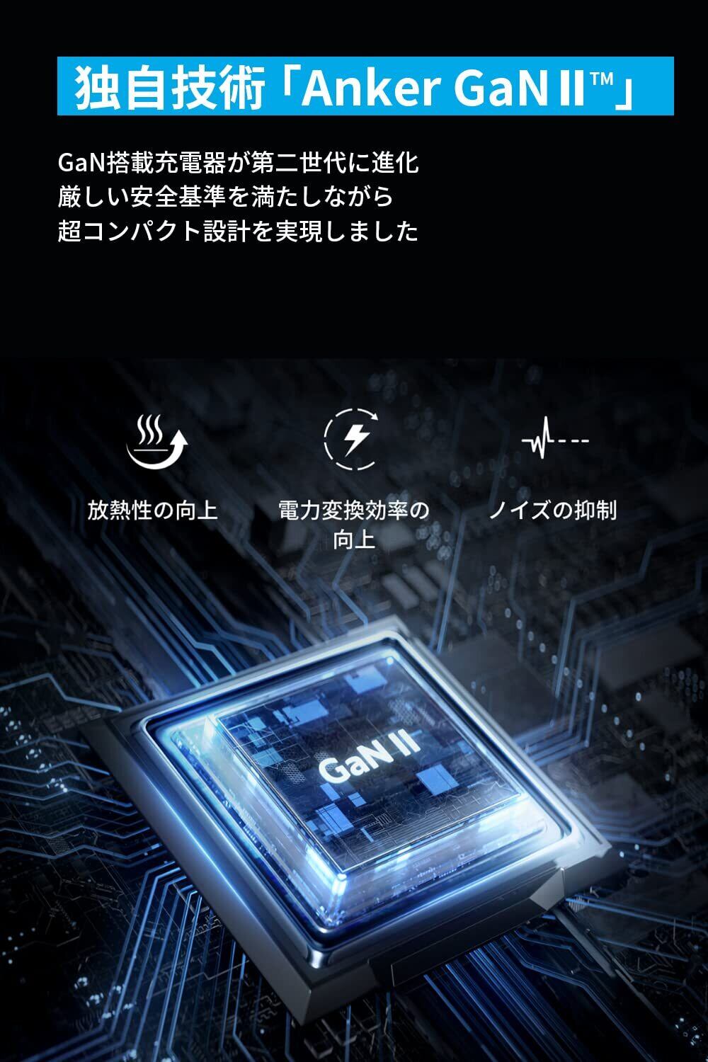 独自技術「Anker GaN II」 採用:GaN(窒化ガリウム)搭載USB充電器が第二世代に進化。電源ICと回路設計に革新を起こすことで、スイッチング周波数を当社比で約2倍に高めて電子部品を省サイズ化するとともに、熱およびEMI(ノイズ)対策を施し厳しい安全基準を満たしながらさらなる小型軽量デザインを実現しました。