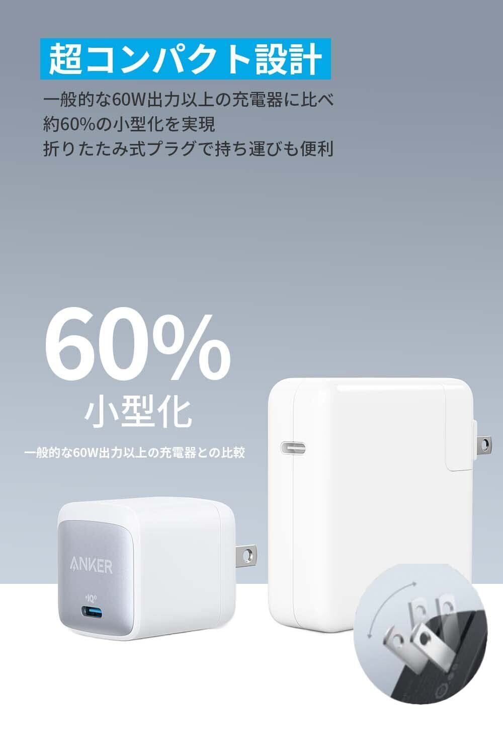超コンパクト設計:一般的な60W出力以上の充電器に比べ約60%小さなコンパクトサイズを実現。折りたたみ式プラグを採用し、どこにでも気軽に持ち運ぶことができます。