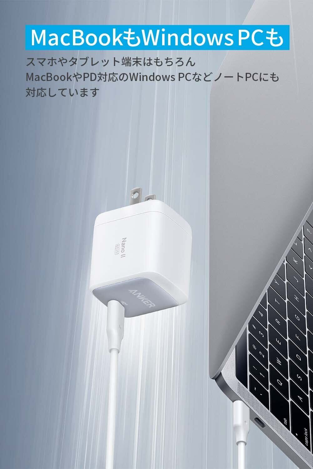 MacBookやPD対応のWindows PCにも対応: 最大65W出力を備え、MacBookだけでなく、PD対応のさまざまなWindows PCにも急速充電できます。一般的なWindows PCに同梱されているACアダプタに比べて非常に軽量かつコンパクトなため、カフェや自宅などでのリモートワークでも快適にご使用いただけます。