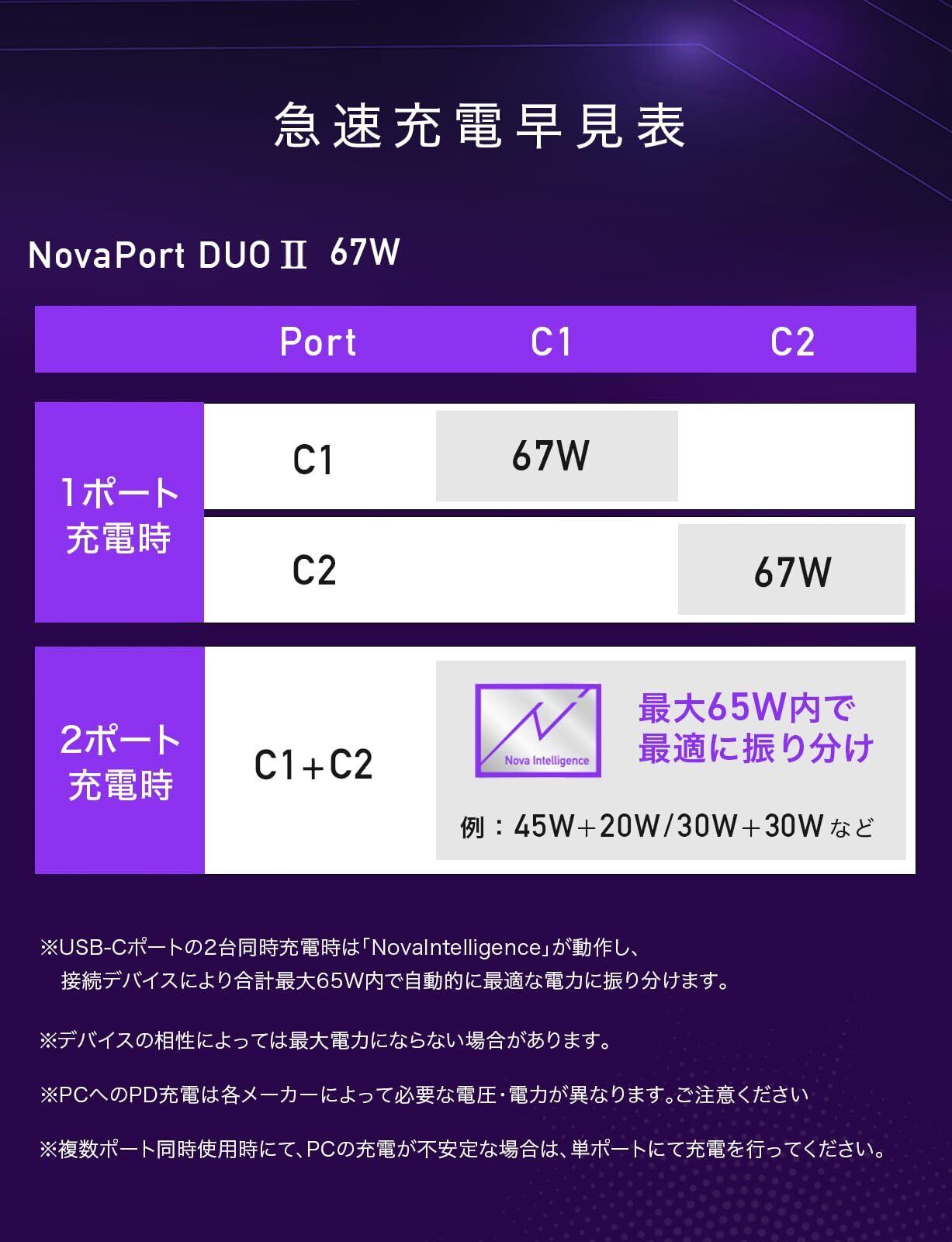 【Nova Intelligence搭載で電力を最適に振り分け】それぞれのUSB タイプC ポートにUSBケーブルを接続するだけで、スマホなどの端末に自動で最大67Wの出力を調整して充電が可能な急速充電器。これまでの充電器のように、接続するUSBポートを迷うことなく最速で充電が可能です。※Nova Intelligenceの仕様は急速充電早見表(画像)をご確認ください。