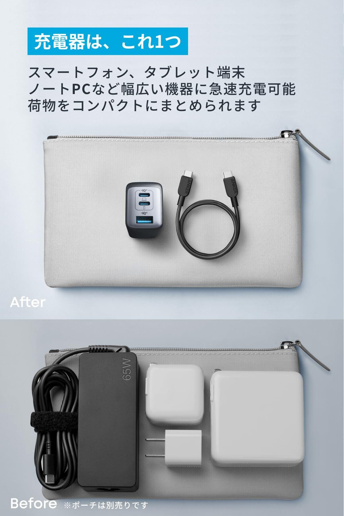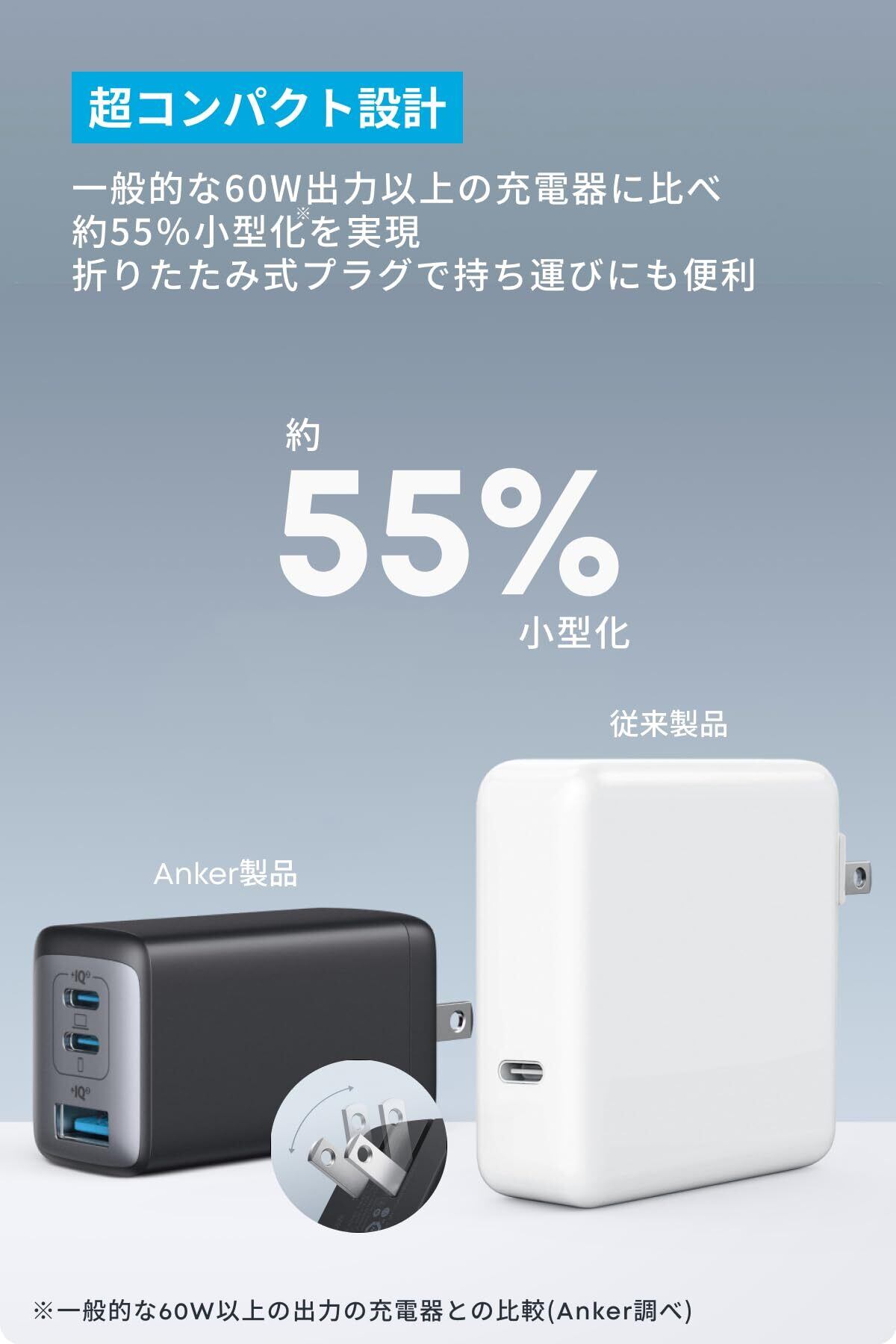 コンパクトで持ち運びやすい:一般的な60W出力以上の充電器と比較して約55%小さいコンパクトサイズ。折りたたみ式プラグを採用しているため、どこへでも気軽に持ち運ぶことができます。
