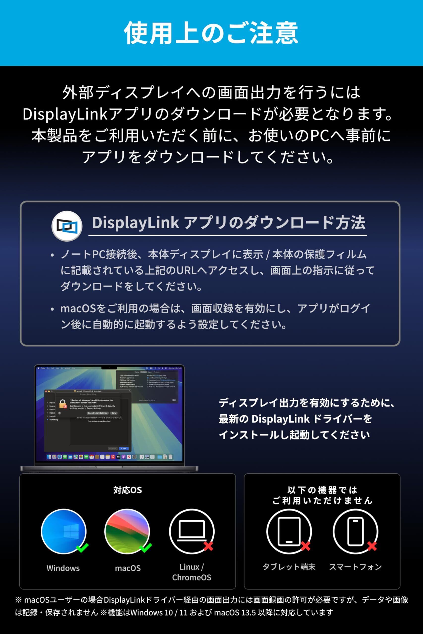 使用上のご注意:外部ディスプレイへの画面出力を行うにはDisplayLinkアプリのダウンロードが必要となります。本製品をご利用いただく前に、お使いのPCへ事前にアプリをダウンロードしてください。