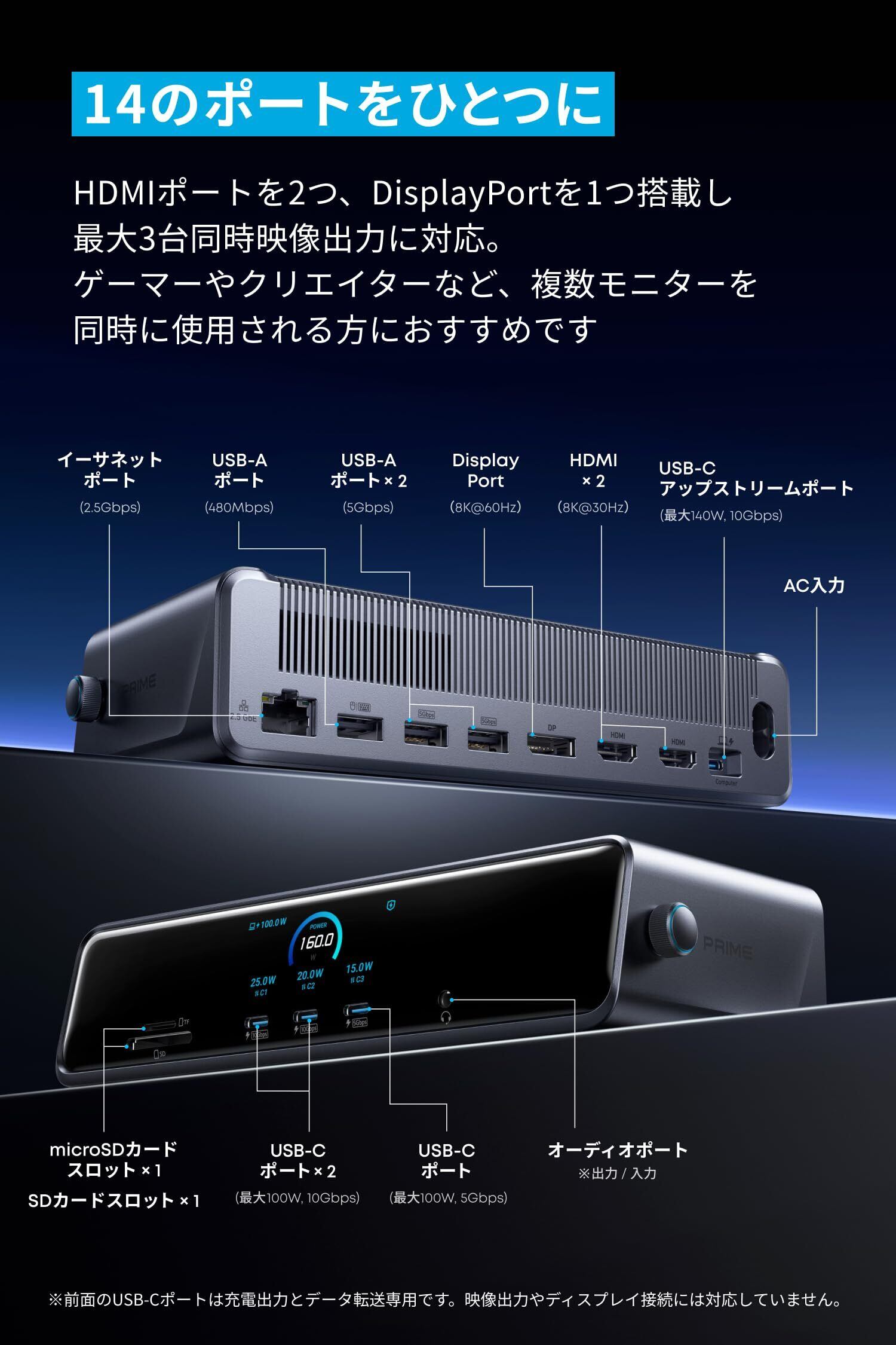 Anker Prime ドッキングステーション (14-in-1, Triple Display, DisplayLink) 最大8K USB PD 最大140W出力対応USB-Cアップストリームポート 3画面同時出力 10Gbps高速データ転送 GaN搭載 ACアダプタ内蔵 冷却システム ディスプレイ搭載 DisplayLinkダウンロード必要