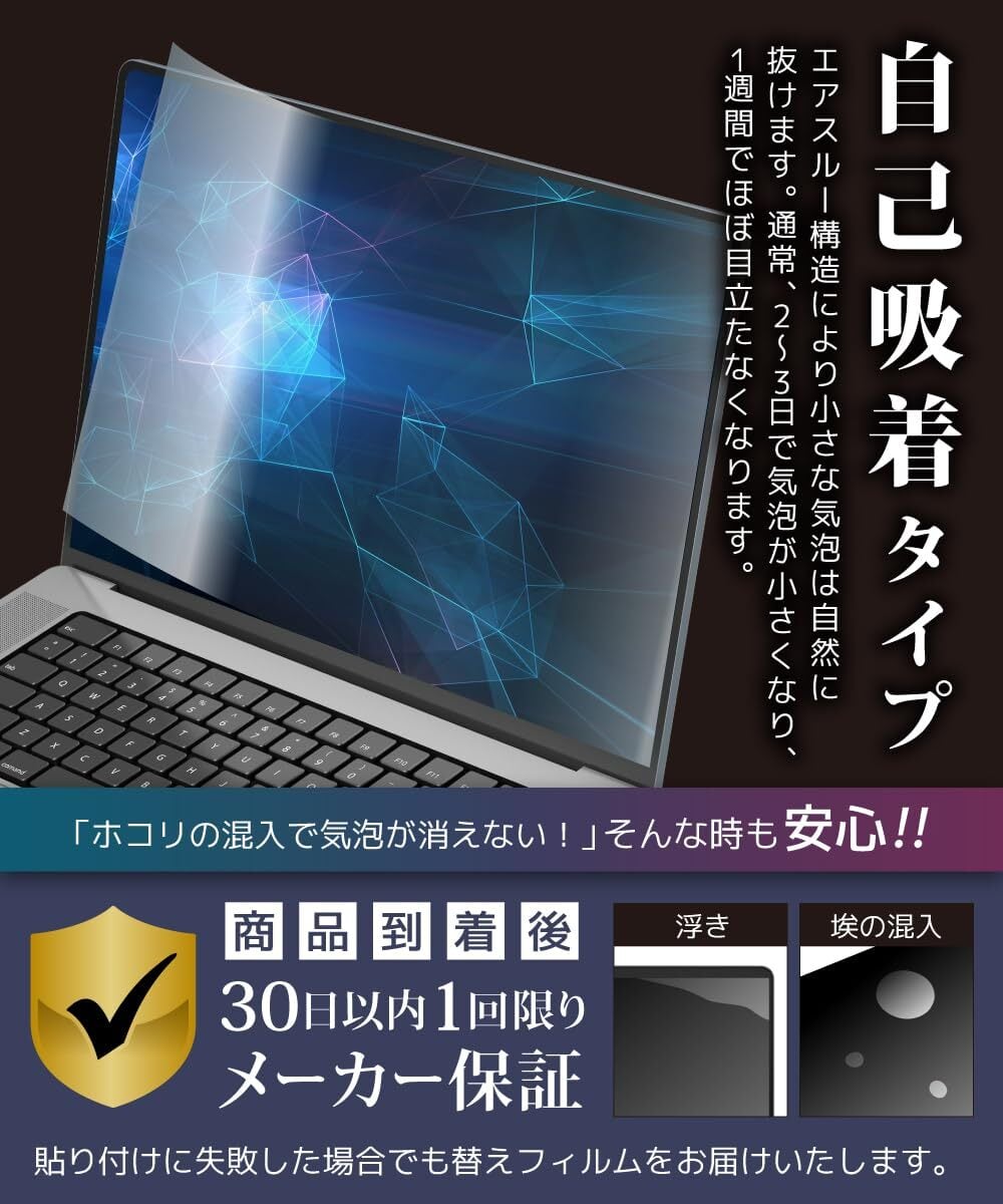 【気泡軽減】 ホコリの混入は大敵です。 大きなサイズのフィルムは特に気泡が入りやすく貼り付け難易度が増す傾向にありますが、本フィルムでは特殊シリコン樹脂を使用しており自然にエアが抜けて液晶画面に気泡が残りにくい特性を兼ね備えています。 説明書を見ながら貼れば初めての人でも大きな失敗もなくキレイに貼れるアクセサリーも付属しています。