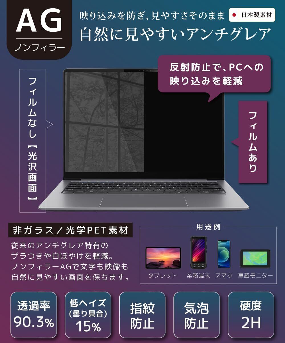 【反射防止】 低干渉対策を施した高透過率のPETフィルムです。一般的なアンチグレアフィルムより透過率90%で色付きやも曇りも少なく綺麗な透明感。