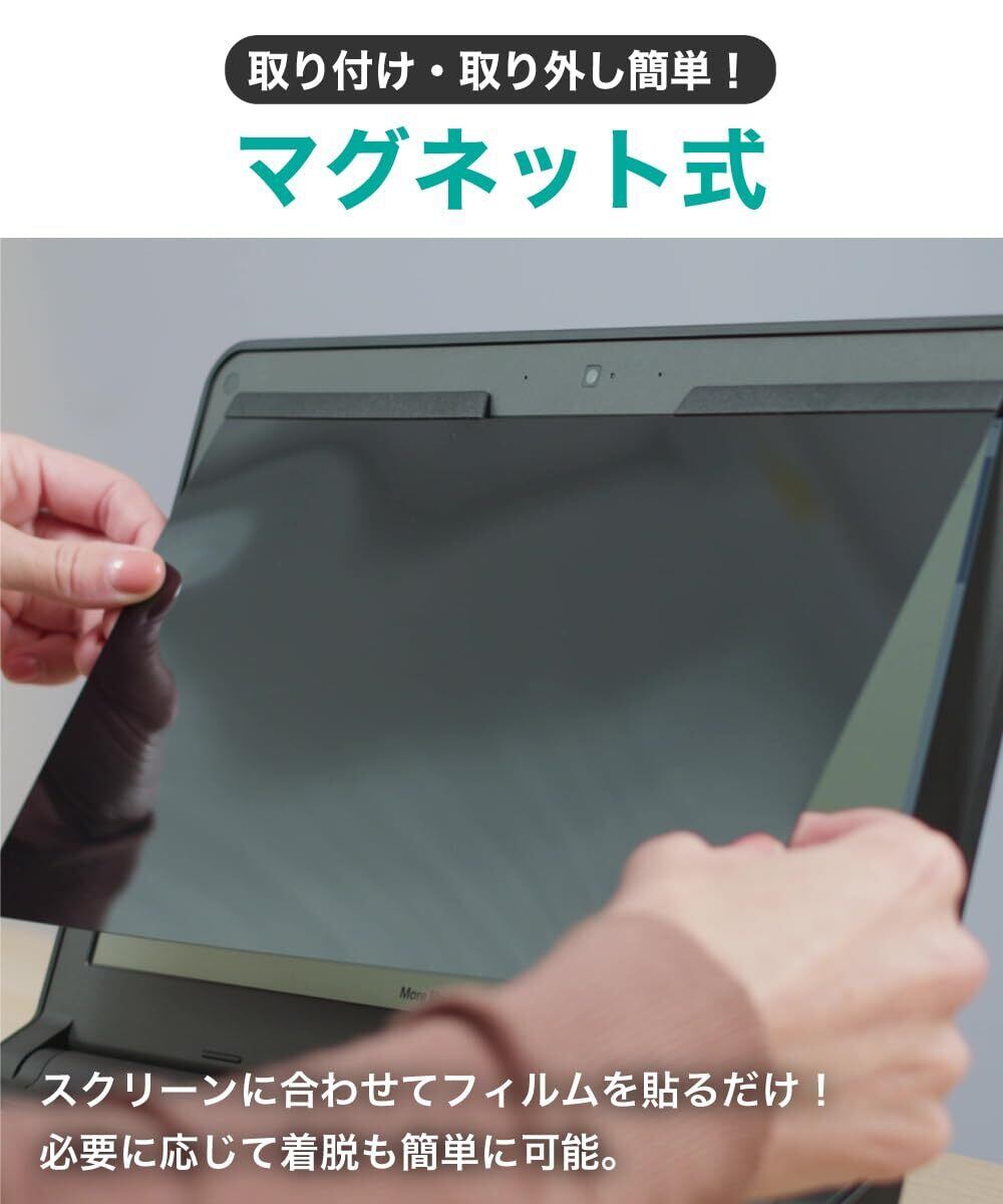 [ マグネット式 ] ワンアクションで簡単に脱着ができるので必要なときだけお使いいただけます。 家ではフィルターを外し、外出先ではフィルターを付けてとあなたのライフスタイルに合わせて安心・安全にお使いいただくことができます。 ※お使いのノートパソコン液晶画面の上部にマグネットが搭載されていない場合は、付属のマグネットシールをご利用ください。