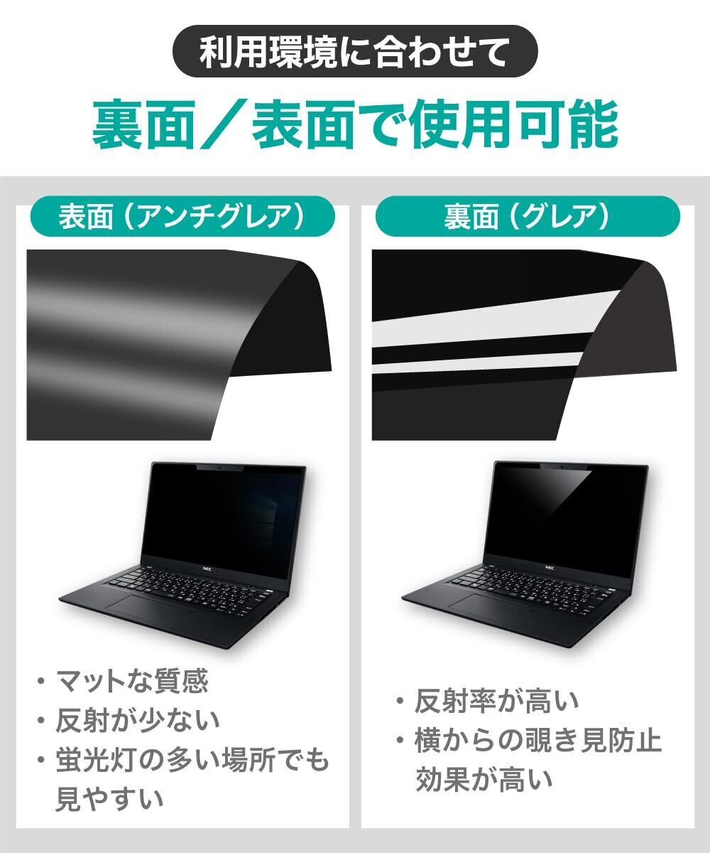 [ リバーシブル ] 表面はマットな質感で反射が少なく蛍光灯の多い場所でも見やすいアンチグレア面(反射防止加工・非光沢)、 裏面は反射率が高くサイドからの覗き見防止効果が大きいグレア面(光沢)です。ご利用環境に合わせてご利用いただくことができます。