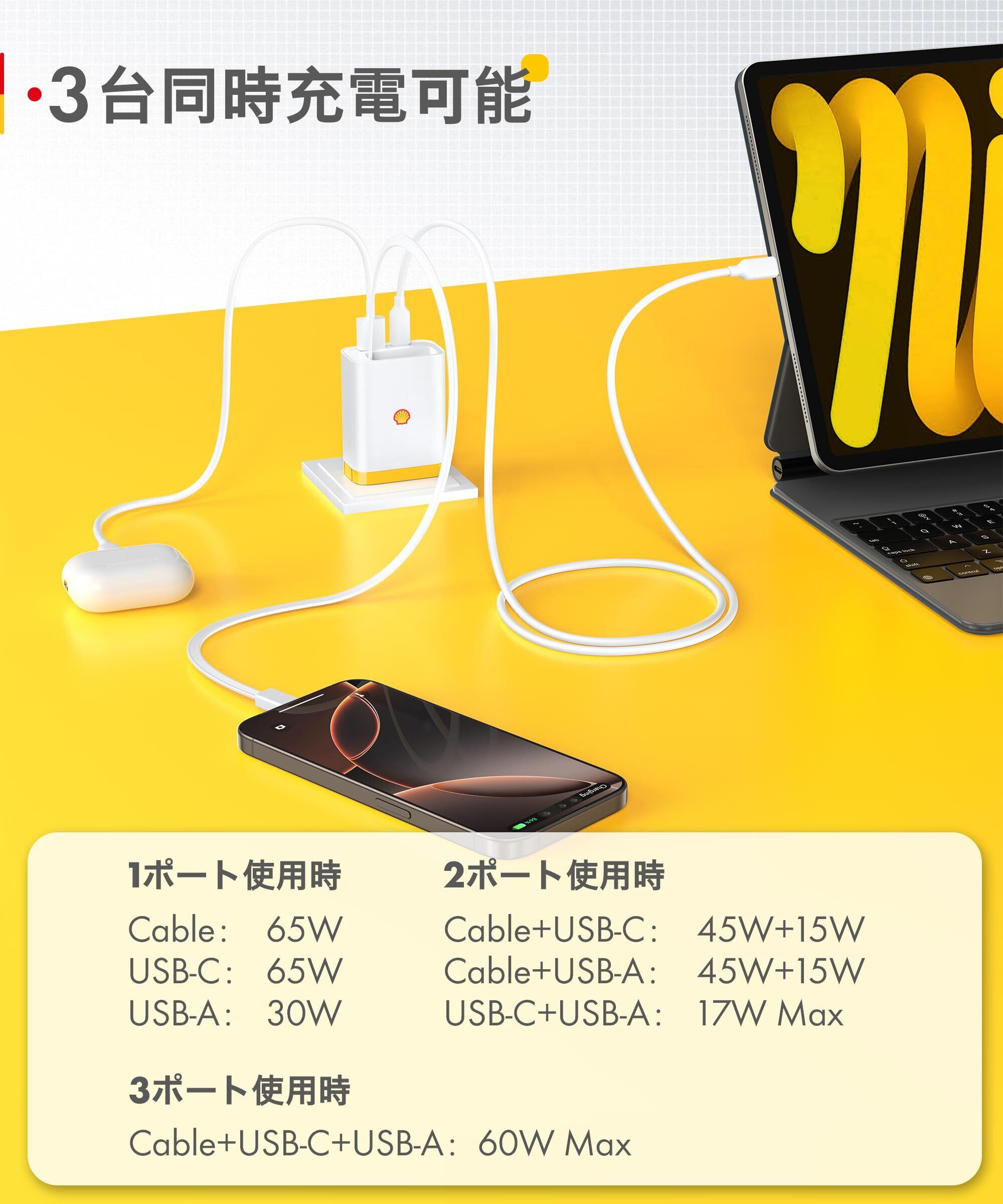Shell 巻き取り式 充電器 65W 3ポート 伸縮85㎝ケーブル内蔵 GaNIII技術 折りたたみ式プラグ PSE認証済み PD3.0/QC4+/PPS規格対応 MacBook iPad iPhone Android ノートPC各種対応