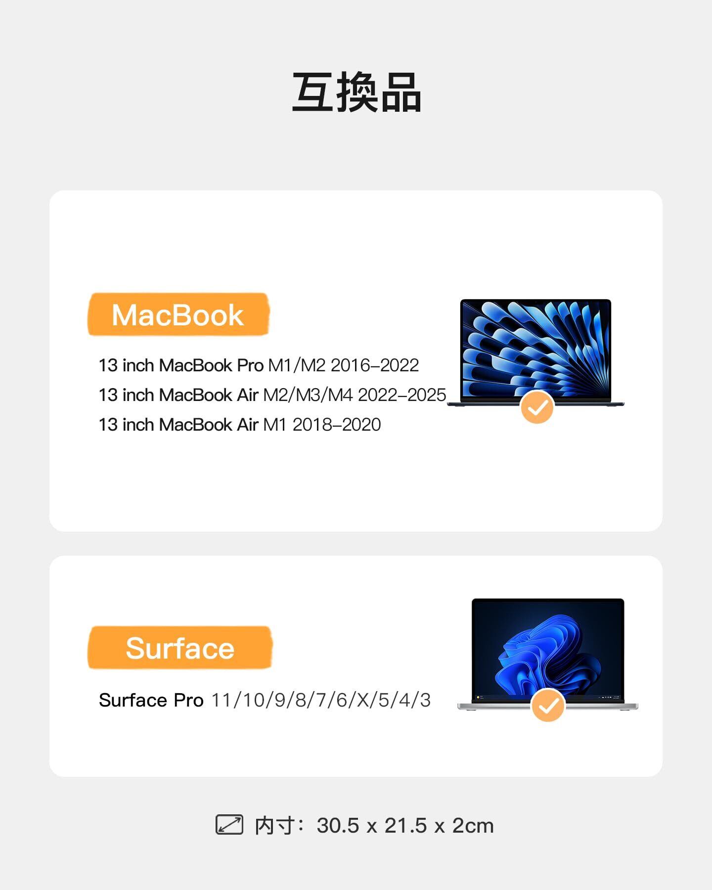 内部寸法:30.5x21.5x2cm;外部寸法:32.5x23.5x3cm。互換品13.3"MacBook Pro 2016-2022(M2/A2686, M1/A2338, A2251, A2289, A2159, A1989, A1708, A1706)、13.3"MacBook Air 2018-2020(M1/A2337, A1932, A2719)、13.6"MacBook Air 2022-2025(M2/A2681,M3/A3113)。互換品Surface Pro 11/10/9/8/7/6/X/5/4/3。