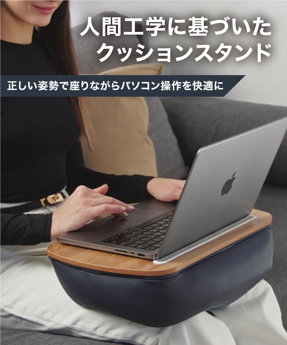 【 長時間の作業でも疲れにくい、体に優しい構造 】ビーズクッションが膝にフィットし、自然に体圧を分散するため、長時間のPC作業でも疲労を軽減。クッション部は前後で厚みが異なるため、自然な傾斜が生まれ、背中や首への負担を減らします。膝上作業を快適にサポートし、正しい姿勢を維持することで肩こりや腰痛の予防にも役立ちます。