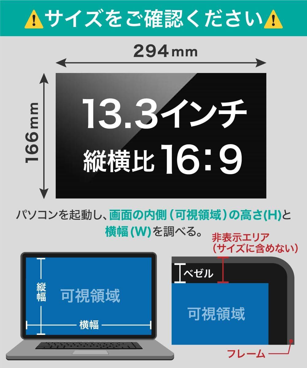 [ フィルターサイズ ] 294x166mm ※注文前にお使いのパソコンの画面を測り、適切なサイズをお選びください。確認方法は商品画像2枚目参照のこと。[ 対応機種一例 ] HP Pavilion Laptop 13 / ENVY X360, マウスコンピューター m-Book J370, ASUS ZenBook 13, Lenovo ThinkBook 13, FMV LIFEBOOK UH, Dell Inspiron 13 5000, NEC VesPro タイプVG FUTRO MU937 など。詳しくは商品画像2枚目のサイズ確認方法をご参照ください。