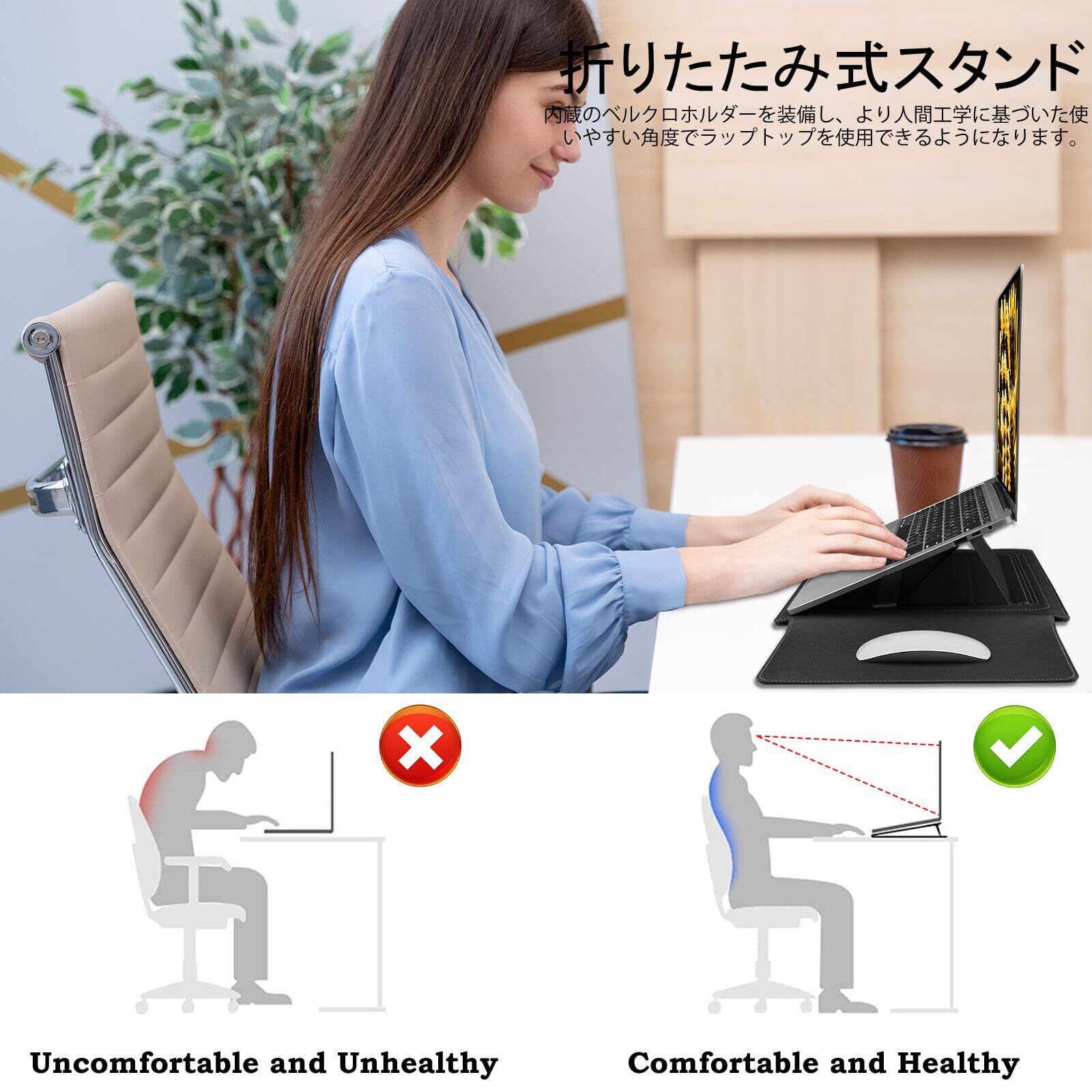 【3in1 ノートパソコンスリーブ】保護ケース、パソコンスタンド、マウスパッドが一体となったデザインで、利便性と実用性をさらに高めています。厚い生地と柔らかい毛織地はコンピュータのためにとても良い保護を提供します。カバーの背面には折りたたみ式のスタンドがついており、スタンド機能を使用後、猫背や首の曲がった状態を防ぐのにも役立ちます。ブラケットは熱を逃がす働きもあり、PCの性能を落としにくくしています。スタンド部分には丈夫な板紙を採用、耐久性に優れています。エッジが滑りにくい設計で、パソコンがスタンドから滑り落ちるのを防ぎます。また、マウスパッド機能は、外出時に便利です。
