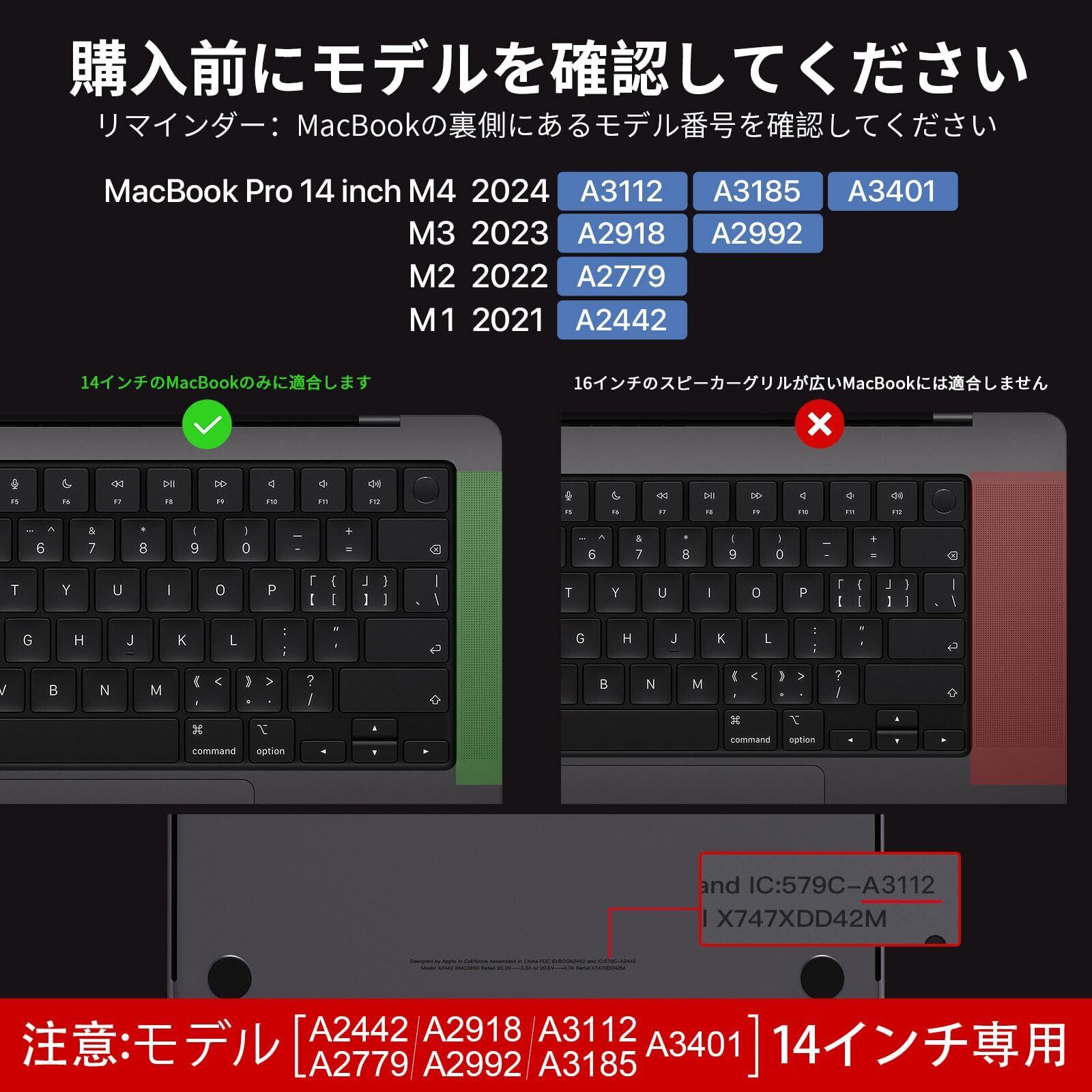 【注意:モデルをご確認ください】MacBook Pro 14インチ 2025-202リリースの M5 M4 M3 M2 M1 Pro / Maxチップ(モデル: A3434 / A3112 / A3185 / A3401 / A2992 / A2918 / A2779 / A2442)にのみ互換性があります。 他のモデルには適合しません。 ご購入前にMacBookの裏側にあるモデル番号【Axxx】をご確認ください。