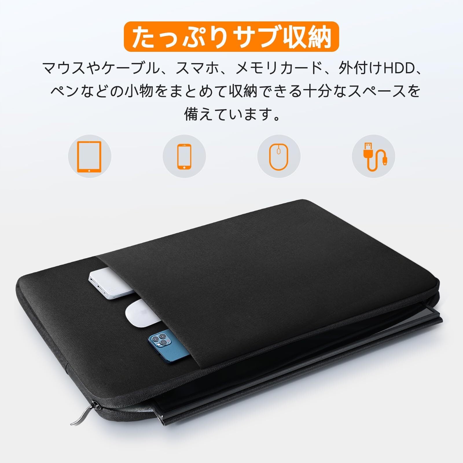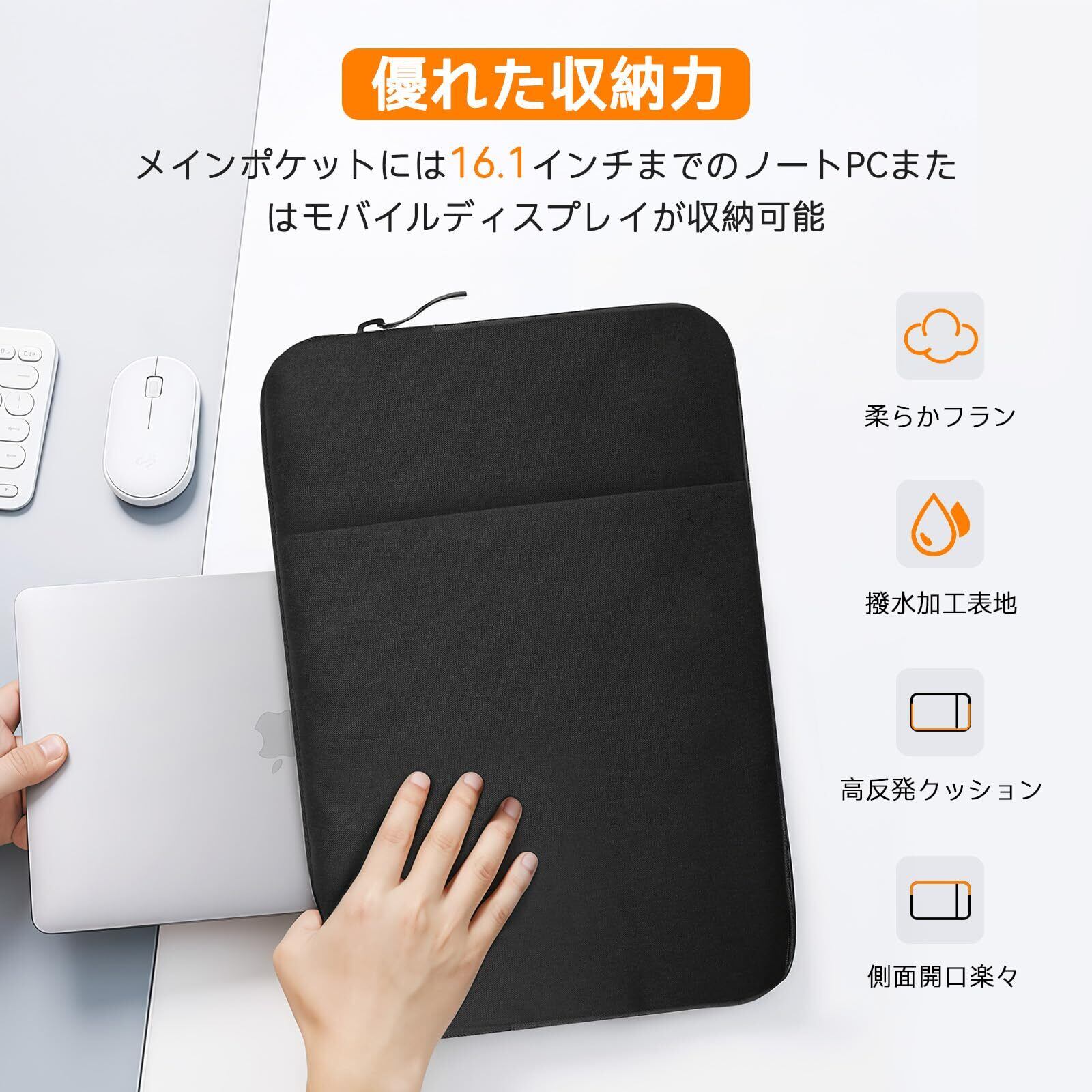 【大容量収納】 パソコンケースのメインポケットは15.6/16インチまでのノートPCやポータブルディスプレイを収納可能。外側ポケットでスマホ、iPad、マウス、ケーブルなど小物も整理できます。
