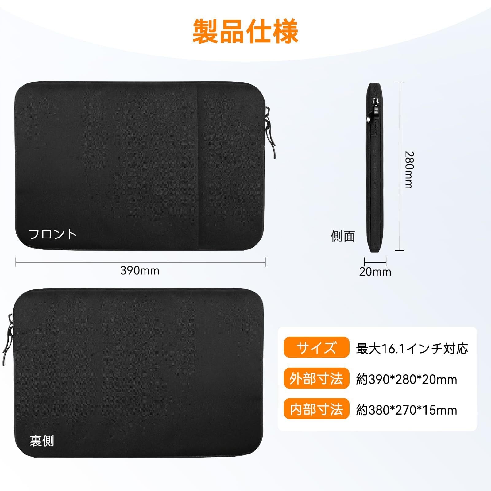 【互換性確認】 ※ご利用前に、ポータブルモニターまたはノートパソコンの外形寸法をご確認ください。内寸38×27×1.5cmのノートPCケースに収まるかどうか、あらかじめご確認をお願いいたします。※最大収容可能サイズ:16.1インチまでのモバイルディスプレイとなります。「14インチ、14.5インチ、15インチ、15.6インチ、16インチなど、一般的なサイズに対応可能です」
